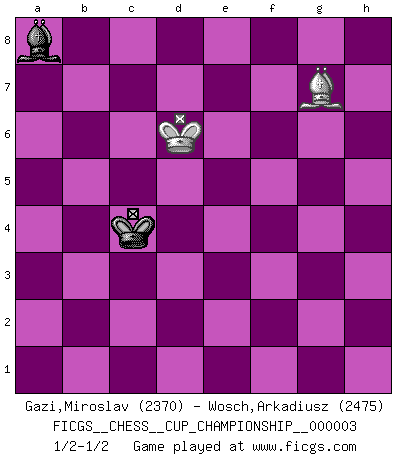 Last move : 1/2-1/2 2021 April 28 15:4:26 [Event "FICGS__CHESS__CUP_CHAMPIONSHIP__000003"] [Site "FICGS"] [Date "2020.07.01"] [Round "1"] [White "Gazi,Miroslav"] [Black "Wosch,Arkadiusz"] [Result "1/2-1/2"] [WhiteElo "2370"] [BlackElo "2475"] 1.e4 c5 2.Nf3 Nc6 3.Bb5 g6 4.Bxc6 dxc6 5.d3 Bg7 6.h3 Nf6 7.Nc3 Nd7 8.Be3 e5 9.Qd2 h6 10.O-O Qe7 11.Nh2 Nf8 12.f4 exf4 13.Bxf4 Ne6 14.Bg3 Qg5 15.Qe1 Nd4 16.Qf2 O-O 17.Bh4 Qe5 18.Rae1 c4 19.dxc4 Be6 20.Nd1 Bxc4 21.Ng4 Qa5 22.Nf6+ Bxf6 23.Bxf6 Ne6 24.Bc3 Qc5 25.Qxc5 Nxc5 26.Rf3 Rfd8 27.Nf2 Be6 28.Bb4 Nd7 29.a3 Re8 30.Bc3 b6 31.Rd1 Rac8 32.Kh2 Nc5 33.b4 Nd7 34.Rfd3 Rc7 35.a4 b5 36.Ng4 Kf8 37.Ne5 Nxe5 38.Bxe5 R7c8 39.a5 Bc4 40.Bd6+ Kg7 41.Rd4 a6 42.Bc5 g5 43.g4 Re6 44.Rd8 Rxd8 45.Rxd8 Rxe4 46.Ra8 h5 47.Rxa6 hxg4 48.hxg4 Rxg4 49.Ra8 Kg6 50.Kh3 Kf5 51.Re8 Bd5 52.Re5+ Kf4 53.Be3+ Kxe5 54.Kxg4 f6 55.Bc5 Be6+ 56.Kh5 Bc8 57.c3 g4 58.Bd4+ Kf4 59.Bxf6 g3 60.Bd4 g2 61.Bc5 Ke4 62.Kg5 Kd3 63.Bd4 c5 64.Bxc5 Kxc3 65.Kf6 Bb7 66.Ke5 g1Q 67.Bxg1 Kxb4 68.Bb6 Kc4 69.Kd6 b4 70.Bd8 Kb5 71.Bb6 Kc4 72.Bc5 b3 73.Ba3 Kb5 74.Kc7 Bh1 75.Bb2 Kxa5 76.Bc3+ Kb5 77.Kd6 Kc4 78.Be5 b2 79.Bxb2 Ba8 80.Bh8 Bh1 81.Bg7 Ba8 82.Bf6 Bh1 83.Be5 Ba8 84.Bb2 Bh1 85.Ba1 Ba8 86.Bb2 Bh1 87.Ba1 Ba8 88.Be5 Bh1 89.Bf6 Ba8 90.Bg7 Bh1 91.Bh8 Ba8 92.Bg7 Bh1 93.Bf6 Ba8 94.Be5 Bh1 95.Bb2 Ba8 96.Bc1 Bh1 97.Bg5 Ba8 98.Bh6 Bh1 99.Bf8 Ba8 100.Bg7 1/2-1/2 Follow this game move after move (download)A bad day of Chess is better than any good day at work. (Anonymous) Bis jetzt ist Weiß einer wohlbekannten Analyse gefolgt. Aber jetzt begeht er einen schrecklichen Fehler: Er beginnt seinen eigenen Kopf zu benutzen. (Siegbert Tarrasch) Al jugar al Ajedrez entonces, podemos aprender: Primero: Previsión... Segundo: Prudencia... Tercero: Cautela... Y al final, aprendemos del Ajedrez el hábito de no ser desanimados por apariencias malas presentes en el estado de nuestros asuntos, el hábito de la esperanza por una oportunidad favorable y la perseveración de los secretos de los recursos. (Benjamin Franklin) Les échecs sont utiles à l'exercice de la faculté de penser et à celle de l'imagination. Car nous devons posséder une méthode élaborée pour atteindre des buts partout où nous devons conduire notre raison. (Leibnitz) The arrogant army will lose certainly the battle. (Chinese proverb)