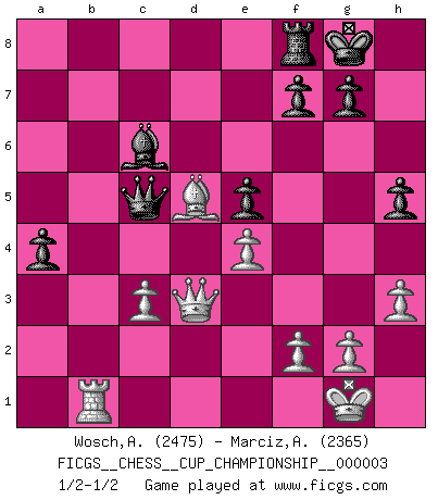 Last move : 1/2-1/2 2020 August 25 19:11:52 [Event "FICGS__CHESS__CUP_CHAMPIONSHIP__000003"] [Site "FICGS"] [Date "2020.07.01"] [Round "1"] [White "Wosch,Arkadiusz"] [Black "Marciz,Alexander"] [Result "1/2-1/2"] [WhiteElo "2475"] [BlackElo "2365"] 1.e4 c5 2.Nf3 Nc6 3.d4 cxd4 4.Nxd4 Nf6 5.Nc3 e5 6.Ndb5 d6 7.Bg5 a6 8.Na3 b5 9.Nd5 Be7 10.Bxf6 Bxf6 11.c3 Rb8 12.Nc2 Bg5 13.a4 bxa4 14.Ncb4 Nxb4 15.Nxb4 Bd7 16.Bxa6 Qa5 17.Qxd6 Rb6 18.Qd3 Be7 19.Nd5 Rxb2 20.O-O Qc5 21.Rab1 Rxb1 22.Rxb1 O-O 23.Nxe7+ Qxe7 24.h3 Bc6 25.Bc4 Qc5 26.Bd5 h5 1/2-1/2 Sicilian : Pelikan (Lasker/Sveshnikov) variation Kingside Castling by player White (move 20) Kingside Castling by player Black (move 22) This chess game ended in a draw. Follow this game move after move (download)Let the perfectionist play postal. (Yasser Seirawan) Du musst Deinen Gegner in einen tiefen dunklen Wald führen wo 2+2=5 ist und wo der Weg, der wieder hinausführt, nur breit genug für einen ist. (Mikhail Nekhemyevich Tal) En el Ajedrez, tal como en la vida, las bendiciones de hoy pueden ser el veneno del mañana. (Assaic) Avant la finale, les dieux ont créé le milieu de partie. (Tarrasch) Knowledge rests not upon truth alone, but upon error also. (Carl G. Jung)