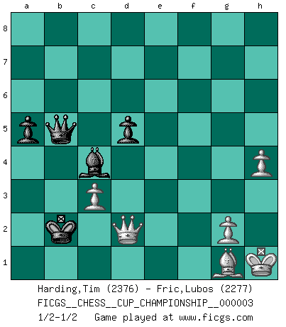 Last move : 1/2-1/2 2020 September 22 18:44:39 [Event "FICGS__CHESS__CUP_CHAMPIONSHIP__000003"] [Site "FICGS"] [Date "2020.07.01"] [Round "1"] [White "Harding,Tim"] [Black "Fric,Lubos"] [Result "1/2-1/2"] [WhiteElo "2376"] [BlackElo "2277"] 1.d4 Nf6 2.c4 e6 3.Nf3 d5 4.Nc3 c6 5.Bg5 h6 6.Bh4 dxc4 7.e4 g5 8.Bg3 b5 9.Be2 Bb7 10.O-O Nbd7 11.Ne5 Bg7 12.Nxf7 Kxf7 13.e5 Nd5 14.Ne4 Qb6 15.Nd6+ Ke7 16.a4 Raf8 17.Bf3 Ba6 18.a5 Qb8 19.Bxd5 cxd5 20.f4 gxf4 21.Rxf4 Rxf4 22.Bxf4 Qg8 23.Qh5 b4 24.Qh4+ Nf6 25.Re1 Qf8 26.Nf5+ Kd7 27.Nxg7 Ne4 28.Nh5 c3 29.Nf6+ Kc7 30.Nxe4 dxe4 31.d5 exd5 32.e6 Kb7 33.bxc3 b3 34.Qh5 Bc4 35.Qe5 Rh7 36.Rxe4 Qc5+ 37.Kh1 b2 38.Re1 Ka6 39.Be3 Qa3 40.Rb1 Rb7 41.Bg1 Kxa5 42.Rxb2 Qxb2 43.e7 Rxe7 44.Qxe7 a6 45.Qf6 Qb5 46.Qxh6 Ka4 47.Qd2 a5 48.h4 Kb3 49.Qd1+ Kb2 50.Qd2+ 1/2-1/2 Queen's pawn game Kingside Castling by player White (move 10) This chess game ended in a draw. Follow this game move after move (download)Nowadays, when you're not a grandmaster at 14, you can forget about it. (Anand Viswanathan) Ich habe die besten Aussichten, den ersten Preis zu gewinnen - denn jeder muss gegen Steinitz spielen, nur ich nicht! (Wilhelm Steinitz) Debemos de asegurarnos de que el Ajedrez no se convierta en un lenguaje muerto, muy interesante, pero solo para un grupo muy pequeño. (Sytze Faber) On n'a jamais que l'âge auquel on a commence à jouer aux échecs car après on cesse de vieillir. (Capablanca) That's absurd. I love it. (Gregory House, House M.D.)