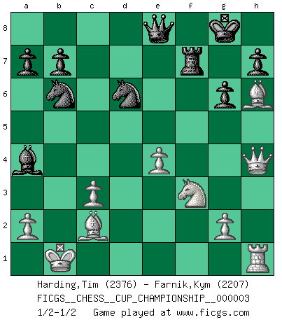 Last move : 1/2-1/2 2020 July 21 13:37:15 [Event "FICGS__CHESS__CUP_CHAMPIONSHIP__000003"] [Site "FICGS"] [Date "2020.07.01"] [Round "1"] [White "Harding,Tim"] [Black "Farnik,Kym"] [Result "1/2-1/2"] [WhiteElo "2376"] [BlackElo "2207"] 1.d4 Nf6 2.c4 g6 3.f3 d5 4.cxd5 Nxd5 5.e4 Nb6 6.Nc3 Bg7 7.Be3 O-O 8.Qd2 e5 9.d5 c6 10.h4 cxd5 11.exd5 N8d7 12.h5 Nf6 13.hxg6 fxg6 14.O-O-O Bd7 15.Kb1 Rc8 16.d6 e4 17.fxe4 Ng4 18.Bg5 Qe8 19.Nf3 Rf7 20.Bd3 Ne5 21.Bh6 Nec4 22.Qf2 Bh8 23.Rc1 Nxd6 24.Qh4 Bxc3 25.Rxc3 Rxc3 26.bxc3 Bb5 27.Bc2 Ba4 28.Bd3 Bb5 29.Bc2 Ba4 1/2-1/2 King's Indian defense Kingside Castling by player Black (move 7) Queenside Castling by player White (move 14) This chess game ended in a draw. Follow this game move after move (download)The battle for the ultimate truth will never be won. And that's why Chess is so fascinating. (Hans Kmoch) Auf jeden Fall musst du zuerst Rechtsanwalt werden, damit du deine eigenen Interessen und die deiner Familie vertreten kannst. [Brief an seinen Sohn] (José Raúl Capablanca) Si el ingenio solamente fuese necesario para lucirse, las mujeres serían las mejores jugadoras de Ajedrez del mundo. (Albin) Un millionnaire : 'Monsieur Steinitz ! Vous ne participez aux tournois que pour l'argent, alors que moi je n'y viens que pour l'honneur.' Steinitz : 'Chacun joue pour ce qu'il n'a pas'... Always two there are. No more no less. A master, and an apprentice. (Master Yoda in Star Wars ep.1)