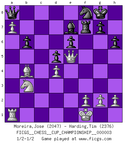 Last move : 1/2-1/2 2020 August 30 22:6:56 [Event "FICGS__CHESS__CUP_CHAMPIONSHIP__000003"] [Site "FICGS"] [Date "2020.07.01"] [Round "1"] [White "Moreira,Jose"] [Black "Harding,Tim"] [Result "1/2-1/2"] [WhiteElo "2047"] [BlackElo "2376"] 1.e4 c6 2.d4 d5 3.e5 Bf5 4.Nf3 e6 5.Be2 Ne7 6.c3 h6 7.Nbd2 Nd7 8.O-O Bh7 9.b4 a5 10.Nb3 axb4 11.cxb4 Nc8 12.Bd2 Ncb6 13.a4 Nc4 14.a5 Be7 15.Bc3 O-O 16.Nfd2 Nxd2 17.Bxd2 b6 18.b5 cxb5 19.a6 b4 20.Bb5 f6 21.a7 fxe5 22.Qc1 Rf7 23.Bc6 Bd3 24.Qe1 Bxf1 25.Kxf1 Qc8 26.Bxa8 Qxa8 27.Bxb4 Nf8 28.Qxe5 Nd7 29.Qe1 Nf8 30.Qe5 Nd7 31.Qe1 Nf8 32.Qe5 1/2-1/2 Caro-Kann : Advance variation Kingside Castling by player White (move 8) Kingside Castling by player Black (move 15) This chess game ended in a draw. Follow this game move after move (download)When asked, -How is that you pick better moves than your opponents?, I responded: I'm very glad you asked me that, because, as it happens, there is a very simple answer. I think up my own moves, and I make my opponent think up his. (Alexander Alekhine) Es ist schade, dass viele Schachsportler vergessen, wie wichtig Auftreten und angemessene Kleidung sind. (Alexandra Kosteniuk) El Ajedrez es el arte del análisis. (Mikhail Botvinnik) Le joueur d'Echecs qui veut atteindre le top est obligé de développer son propre credo créatif. Alexeï Stepanovicth Souétine. Il est facile d'écrire des livres ! Ce qui est difficile, c'est de jouer ! (Alexeï Stepanovicth Souétine) Dave, my mind is going. I can feel it. (HAL 9000 in 2001, a space odyssey)