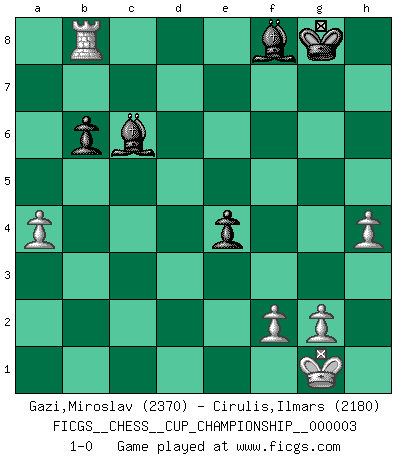 Last move : 1-0 2020 August 8 23:10:24 [Event "FICGS__CHESS__CUP_CHAMPIONSHIP__000003"] [Site "FICGS"] [Date "2020.07.01"] [Round "1"] [White "Gazi,Miroslav"] [Black "Cirulis,Ilmars"] [Result "1-0"] [WhiteElo "2370"] [BlackElo "2180"] 1.e4 c5 2.Nf3 Nc6 3.Bb5 g6 4.Bxc6 bxc6 5.O-O Bg7 6.Re1 e5 7.c3 Ne7 8.d4 cxd4 9.cxd4 exd4 10.Nxd4 O-O 11.Nc3 Rb8 12.Rb1 c5 13.Nde2 Nc6 14.Be3 d6 15.Qd2 Ba6 16.Red1 Qa5 17.Nf4 Nd4 18.Nfd5 Rb7 19.Bg5 f6 20.Bf4 Qd8 21.b4 Rbf7 22.Qc1 Bb7 23.Qa3 f5 24.bxc5 dxc5 25.Qxc5 Ne6 26.Qb4 Nxf4 27.Nxf4 Qb6 28.Qxf8+ Rxf8 29.Rxb6 axb6 30.Ncd5 fxe4 31.Ne7+ Kh8 32.Nexg6+ hxg6 33.Nxg6+ Kg8 34.Nxf8 Bxf8 35.Rd8 Bc6 36.Rb8 Bd5 37.a4 Bc6 38.h4 1-0 Sicilian : Nimzovich-Rossolimo attack (with ...g6, without ...d6) Kingside Castling by player White (move 5) Kingside Castling by player Black (move 10) Player White won this chess game. Follow this game move after move (download)The combination player thinks forward; he starts from the given position, and tries the forceful moves in his mind. (Emanuel Lasker) Wenn du gegen Bobby spielst, ist es keine Frage von gewinnen oder verlieren. Es ist eine Frage des Überlebens. (Boris Vassilievich Spassky) Existen dos clases de sacrificios: los correctos y los míos. (Mikhail Tal) Toutes les manuvres exécutées sur une colonne ouverte ont pour but ultime l'intrusion définitive sur la septième ou la huitième rangée, en plein cur de la position ennemie. (Aaron Nimzovitch) Man with more than one clock never knows what time it is. (Chinese thought)