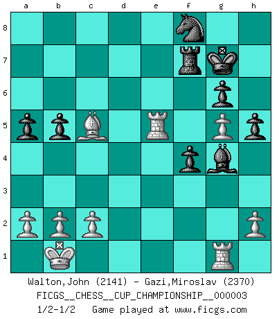 Last move : 1/2-1/2 2020 October 4 22:36:0 [Event "FICGS__CHESS__CUP_CHAMPIONSHIP__000003"] [Site "FICGS"] [Date "2020.07.01"] [Round "1"] [White "Walton,John"] [Black "Gazi,Miroslav"] [Result "1/2-1/2"] [WhiteElo "2141"] [BlackElo "2370"] 1.e4 c5 2.Nf3 d6 3.d4 cxd4 4.Nxd4 Nf6 5.Nc3 a6 6.Bg5 Nbd7 7.Qe2 h6 8.Bh4 g6 9.f4 e5 10.fxe5 dxe5 11.O-O-O Qc7 12.Nb3 b5 13.Nd5 Nxd5 14.exd5 Bd6 15.Qd2 f5 16.g4 f4 17.Bd3 Kf7 18.Qg2 Bb7 19.g5 h5 20.Bf2 Rhe8 21.Kb1 Kg7 22.Qe4 Nf8 23.Qf3 Qf7 24.Be4 Bc8 25.Rhg1 a5 26.Nd2 Rb8 27.Bd3 Bb7 28.Be4 Bc8 29.Bd3 Rd8 30.Ne4 Qxd5 31.Be2 Qc6 32.Nxd6 Rxd6 33.Qxc6 Rxc6 34.Ba7 Rb7 35.Bf3 R6c7 36.Bxb7 Rxb7 37.Bc5 Bg4 38.Rde1 Rf7 39.Rxe5 1/2-1/2 Sicilian : Najdorf, 6.Bg5 Queenside Castling by player White (move 11) This chess game ended in a draw. Follow this game move after move (download)Good offense and good defense both begin with good development. (Bruce A. Moon) Schach ist ein Kampf gegen den Fehler. (Johannes Herrman Zukertort) La única cosa que los jugadores de Ajedrez tienen en común, es el Ajedrez. (Lodewijk Prins) Les réformistes prétendent que les progrès de la théorie conduiront à la disparition des échecs, et qu'il faut, pour leur rendre vie, en remanier les règles. En réalité, qu'exprime cette affirmation? Le mépris de l'intuition, de l'imagination et de tous les autres éléments qui font des échecs un art. (Alexander Alekhine) In my experience, there's no such thing as luck. (Obi-Wan Kenobi in Star Wars ep.4)