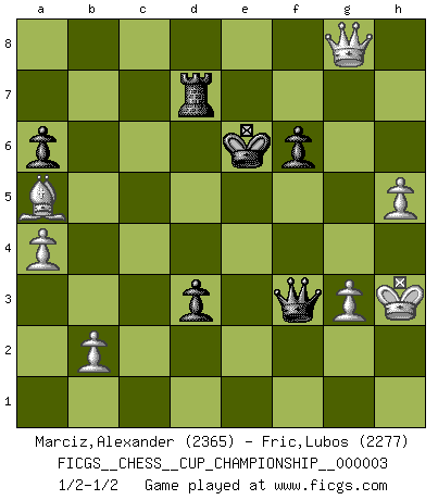 Last move : 1/2-1/2 2020 September 22 19:14:35 [Event "FICGS__CHESS__CUP_CHAMPIONSHIP__000003"] [Site "FICGS"] [Date "2020.07.01"] [Round "1"] [White "Marciz,Alexander"] [Black "Fric,Lubos"] [Result "1/2-1/2"] [WhiteElo "2365"] [BlackElo "2277"] 1.d4 d5 2.c4 c6 3.Nf3 Nf6 4.Nc3 e6 5.Bg5 dxc4 6.e4 b5 7.e5 h6 8.Bh4 g5 9.Nxg5 hxg5 10.Bxg5 Nbd7 11.exf6 Bb7 12.g3 Qb6 13.Bg2 O-O-O 14.O-O c5 15.d5 b4 16.Na4 Qa6 17.a3 Bxd5 18.Bxd5 Ne5 19.Nxc5 Bxc5 20.Qe2 exd5 21.Qxe5 b3 22.Rae1 Qc6 23.h4 Kb7 24.Qc3 Rde8 25.Re7+ Bxe7 26.fxe7 Rhg8 27.Re1 Rg6 28.Re3 f6 29.Bf4 Rg7 30.Qa5 Ka8 31.Kh2 Kb7 32.Re2 a6 33.a4 Rh7 34.f3 d4 35.Qb4+ Qb6 36.Qxc4 Rhxe7 37.Rxe7+ Rxe7 38.h5 Rd7 39.Kh3 d3 40.Bd2 Qc6 41.Qxb3+ Kc8 42.Qg8+ Rd8 43.Qb3 Qxf3 44.Qe6+ Rd7 45.Qe8+ Kc7 46.Ba5+ Kd6 47.Qb8+ Ke6 48.Qg8+ Rf7 49.Qc8+ Rd7 50.Qg8+ Rf7 51.Qc8+ Rd7 52.Qg8+ 1/2-1/2 QGD Slav : 4.Nc3 Queenside Castling by player Black (move 13) Kingside Castling by player White (move 14) This chess game ended in a draw. Follow this game move after move (download)Weak points or holes in the opponent's position must be occupied by pieces not Pawns. (Siegbert Tarrasch) Ich habe Putins Aufstieg an die Macht beobachtet und seine Politik, die demokratischen Institutionen meines Landes zu zerstören. (Garry Kasparov) De eso se trata el Ajedrez. Un día le das una lección a tu oponente y al día siguiente el te da una a tí. (Bobby Fischer) Lorsque vous vous retrouvez devant une position atroce, ne tendez pas un ultime piège dérisoire avec l'intention d'abandonner si l'adversaire le déjoue ! Faites-vous plutôt un devoir de résister comme si votre vie en dépendait. Jouez le coup qui vous déplairait au centuple si vous étiez dans la peau de votre tortionnaire ! Have no fear of perfection - you'll never reach it. (Salvador Dali)