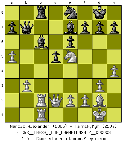 Last move : 1-0 2020 July 29 5:21:11 [Event "FICGS__CHESS__CUP_CHAMPIONSHIP__000003"] [Site "FICGS"] [Date "2020.07.01"] [Round "1"] [White "Marciz,Alexander"] [Black "Farnik,Kym"] [Result "1-0"] [WhiteElo "2365"] [BlackElo "2207"] 1.d4 Nf6 2.Nf3 d5 3.c4 e6 4.g3 Bb4+ 5.Bd2 Be7 6.Bg2 c6 7.Qc2 O-O 8.O-O b6 9.Rd1 Nbd7 10.b3 Ba6 11.a4 Qc7 12.Bf4 Qd8 13.Nbd2 Nh5 14.Be3 Rc8 15.Ne5 c5 16.Nxd7 Qxd7 17.a5 cxd4 18.Bxd4 b5 19.c5 b4 20.Nf3 Qc7 21.Ne5 Nf6 22.Rdc1 Rfd8 23.c6 Rd6 24.h4 Bb5 25.Ra2 Ne8 26.Bc5 Rcd8 27.Bxb4 Rc8 28.Bxd6 Bxd6 29.Nf3 Bxc6 30.Qd2 Qb7 31.Rac2 Be7 32.Ne5 1-0 Queen's pawn game Kingside Castling by player Black (move 7) Kingside Castling by player White (move 8) Player White won this chess game. Follow this game move after move (download)You have to have the fighting spirit. You have to force moves and take chances. (Bobby Fischer) Ein Isolani verdüstert die Stimmung auf dem ganzen Schachbrett. (Savielly Grigorievitsch Tartakower) Cuando veas una buena jugada, trata de encontrar otra mejor. (Emanuel Lasker) Il vaut toujours mieux jouer un plan faux de façon logique que de n'avoir pas de plan du tout. (Victor Kortchnoï) Humor is by far the most significant activity of the human brain. (Edward De Bono)