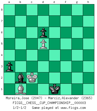 Last move : 1/2-1/2 2020 September 15 0:21:15 [Event "FICGS__CHESS__CUP_CHAMPIONSHIP__000003"] [Site "FICGS"] [Date "2020.07.01"] [Round "1"] [White "Moreira,Jose"] [Black "Marciz,Alexander"] [Result "1/2-1/2"] [WhiteElo "2047"] [BlackElo "2365"] 1.e4 c5 2.Nf3 Nc6 3.d4 cxd4 4.Nxd4 Nf6 5.Nc3 e5 6.Ndb5 d6 7.Bg5 a6 8.Na3 b5 9.Nd5 Be7 10.Bxf6 Bxf6 11.c3 Rb8 12.Nc2 Bg5 13.a3 Ne7 14.Nxe7 Bxe7 15.Nb4 Bb7 16.Nd5 Bg5 17.g3 O-O 18.Bh3 a5 19.O-O h5 20.Qd3 h4 21.Rad1 Re8 22.Kh1 Bc6 23.Qe2 Rb7 24.Kg2 g6 25.Qd3 Ra7 26.Qf3 Kh8 27.Qd3 Bh6 28.Kg1 Kg7 29.Rfe1 Qb8 30.Qe2 hxg3 31.hxg3 Rh8 32.Kg2 Qb7 33.Qf3 Bg5 34.Qd3 R7a8 35.f4 exf4 36.Qd4+ Kg8 37.gxf4 Bxd5 38.exd5 Rh4 39.Re4 f5 40.Re6 Qh7 41.Rd3 Bxf4 42.Qf6 Rh5 43.Re7 Rf8 44.Rxh7 Rxf6 45.Rxh5 gxh5 46.Rf3 Bc1 47.Rxf5 Rxf5 48.Bxf5 Bxb2 49.Bg6 Bxa3 50.Bxh5 Bb2 51.Be8 a4 52.Bxb5 a3 53.Bc4 Bxc3 54.Kf1 Kf7 55.Ke2 Kf6 56.Kd3 Ba1 57.Ba2 Ke5 58.Kc4 Bb2 59.Kd3 Kf4 60.Bc4 Kf3 61.Ba2 Kf2 62.Bb1 Ke1 63.Kc2 1/2-1/2 Sicilian : Pelikan (Lasker/Sveshnikov) variation Kingside Castling by player Black (move 17) Kingside Castling by player White (move 19) 10 pieces endgame at move 49 : White KBPP , Black KBPPPP WHITE : King + 1 Bishop 2 Pawns BLACK : King + 1 Bishop 4 Pawns 9 pieces endgame at move 50 : White KBPP , Black KBPPP WHITE : King + 1 Bishop 2 Pawns BLACK : King + 1 Bishop 3 Pawns 8 pieces endgame at move 52 : White KBPP , Black KBPP WHITE : King + 1 Bishop 2 Pawns BLACK : King + 1 Bishop 2 Pawns 7 pieces endgame at move 53 : White KBP , Black KBPP WHITE : King + 1 Bishop 1 Pawn BLACK : King + 1 Bishop 2 Pawns This chess game ended in a draw. Follow this game move after move (download)The sign of a great Master is his ability to win a won game quickly and painlessly. (Irving Chernev) Im Wettkampf zwischen starken Meistern kommen Fehler sehr selten vor, deshalb ist es mit bloßem Warten nicht getan. (José Raúl Capablanca) Me dio la sensación de como si yo estuviera jugando en contra del mismo Ajedrez. - al estar jugando en contra de Robert Fischer (Walter Shipman) À la honte des hommes, on sait que les lois du jeu sont les seules qui soient partout justes, claires, inviolables et exécutées. Pourquoi l'Indien qui a donné les règles du jeu d'échecs est-il obéi de bon gré dans toute la terre, et que les décrétales des papes, par exemple, sont aujourd'hui un objet d'horreur et de mépris ? C'est que l'inventeur des échecs combina tout avec justesse pour la satisfaction des joueurs, et que les papes, dans leurs décrétales, n'eurent en vue que leur seul avantage. L'Indien voulut exercer également l'esprit des hommes et leur donner du plaisir; les papes ont voulu abrutir l'esprit des hommes. Voltaire (Dictionnaire philosophique / Garnier 1967) The modern world has divided itself into Conservatives and Progressives. The business of Progressives is to go on making mistakes. The business of the Conservatives is to prevent the mistakes from being corrected. (G.K. Chesterton)