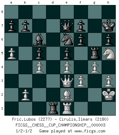 Last move : 1/2-1/2 2020 September 20 13:15:24 [Event "FICGS__CHESS__CUP_CHAMPIONSHIP__000003"] [Site "FICGS"] [Date "2020.07.01"] [Round "1"] [White "Fric,Lubos"] [Black "Cirulis,Ilmars"] [Result "1/2-1/2"] [WhiteElo "2277"] [BlackElo "2180"] 1.e4 e5 2.Nf3 Nc6 3.Bb5 Nf6 4.d3 Bc5 5.Ba4 O-O 6.O-O d6 7.c3 Ne7 8.h3 Ng6 9.Bc2 Bb6 10.Nbd2 c5 11.Re1 h6 12.Nf1 Be6 13.Ne3 Rc8 14.Bd2 Re8 15.a4 Bc7 16.Nh2 d5 17.c4 dxe4 18.dxe4 Ba5 19.Bxa5 Qxa5 20.Nhf1 Kh8 21.Qd3 Ne7 22.Nd5 Nc6 23.Nxf6 gxf6 24.Qe3 Kh7 25.Ng3 Rg8 26.Nh5 Qd8 27.Rad1 Nd4 28.Bd3 Rg5 29.g4 Kh8 30.Kh1 Qd6 31.a5 Bd7 32.f3 Bc6 33.Ng3 Kh7 34.Kh2 Rd8 35.Nf5 Qf8 36.Ng3 Ne6 37.Nh5 Qe7 38.Be2 Rxd1 1/2-1/2 Ruy Lopez : Berlin defense Kingside Castling by player Black (move 5) Kingside Castling by player White (move 6) This chess game ended in a draw. Follow this game move after move (download)To avoid losing a piece, many a person has lost the game. (Savielly Tartakover) Versuche, dich von der Sklaverei der Eröffnungsvarianten zu befreien. Stattdessen soll man gewisse Typenpositionen erlernen, die man eingehend analysiert. (Aaron Nimzowitsch) El Ajedrez es como la guerra en un tablero. (Bobby Fischer) Des combinaisons [dans le jeu d'échecs] pareilles à des mélodies. Je crois entendre pour ainsi dire la musique des coups... (Vladimir Nabokov) Gambling is the son of avarice and the father of despair. (French proverb)