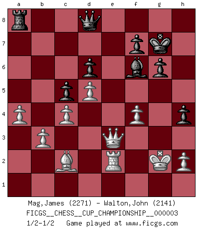 Last move : 1/2-1/2 2020 August 23 20:28:13 [Event "FICGS__CHESS__CUP_CHAMPIONSHIP__000003"] [Site "FICGS"] [Date "2020.07.01"] [Round "1"] [White "Mag,James"] [Black "Walton,John"] [Result "1/2-1/2"] [WhiteElo "2271"] [BlackElo "2141"] 1.e4 c5 2.Nf3 d6 3.d4 cxd4 4.Nxd4 Nf6 5.Nc3 a6 6.Be3 e5 7.Nb3 Be6 8.f3 h5 9.Nd5 Bxd5 10.exd5 Nbd7 11.Qd2 g6 12.Be2 Bg7 13.O-O b6 14.Rae1 O-O 15.c4 Re8 16.Kh1 Rc8 17.Qd1 a5 18.a4 Rb8 19.Qc2 Nc5 20.Nxc5 bxc5 21.b3 e4 22.Bd1 Qd7 23.Bd2 exf3 24.gxf3 Qh3 25.Bxa5 Ra8 26.Rxe8+ Nxe8 27.Re1 Rxa5 28.Rxe8+ Kh7 29.Qg2 Qf5 30.Re4 Ra8 31.Bc2 Qf6 32.Qg3 Kg8 33.Kg2 Qd8 34.Re2 Bf6 35.f4 h4 36.Qf2 Kg7 37.Qe3 Qa5 38.Qd2 Qd8 39.Qe3 Qa5 40.Qd2 Qd8 41.Qe3 1/2-1/2 Sicilian : Najdorf, Byrne (English) attack Kingside Castling by player White (move 13) Kingside Castling by player Black (move 14) This chess game ended in a draw. Follow this game move after move (download)When you are lonely, when you feel yourself an alien in the world, play Chess. This will raise your spirits and be your counselor in war. (Aristotle) Wenn sie aufgeben, dann danke ich Ihnen für das Spiel (Eventualzug beim Fernschach). (Anonymous) El Ajedrez no es como la vida... ¡tiene reglas!. (Mark Pasternak) Les erreurs sont comme les malheurs, elles n'arrivent jamais seules. (Siegbert Tarrasch) I don't diet. I just don't eat as much as I'd like to. (Linda Evangelista, supermodel)