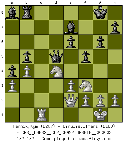 Last move : 1/2-1/2 2020 August 6 14:11:3 [Event "FICGS__CHESS__CUP_CHAMPIONSHIP__000003"] [Site "FICGS"] [Date "2020.07.01"] [Round "1"] [White "Farnik,Kym"] [Black "Cirulis,Ilmars"] [Result "1/2-1/2"] [WhiteElo "2207"] [BlackElo "2180"] 1.d4 d5 2.Bf4 Nf6 3.Nf3 c5 4.e3 Nc6 5.Be2 Nh5 6.Be5 e6 7.O-O cxd4 8.Bxd4 Be7 9.c4 O-O 10.Bc3 Nf6 11.Qc2 Bd7 12.Nbd2 dxc4 13.Bxc4 a6 14.Rac1 b5 15.Bb3 a5 16.Qb1 a4 17.Bc2 g6 18.b3 Nd5 19.Be4 Nxc3 20.Rxc3 Rc8 21.Rfc1 Nb4 22.Rxc8 Bxc8 23.a3 Nd5 24.b4 Bb7 25.Qd3 Qd7 26.Ne5 Qd6 27.Nef3 Qd7 28.Nd4 Rb8 29.N2f3 f5 30.Bxd5 Qxd5 31.Qe2 Ba8 1/2-1/2 Queen's pawn, Mason variation Kingside Castling by player White (move 7) Kingside Castling by player Black (move 9) This chess game ended in a draw. Follow this game move after move (download)Help your pieces so they can help you. (Paul Morphy) Wenn du auf das Glück wartest, wird das Leben ziemlich langweilig. (Mikhail Nekhemyevich Tal) El Peón aislado arroja penumbra sobre todo el tablero. (Aaron Nimzovich) Demandez au pauvre Cg1 ce qu'il en pense. Eduard Gufeld à propos de la variante Saemisch de l'Est-Indienne. Life is like a ten-speed bicycle: most of us have gears we never use. (Charles M. Schulz)