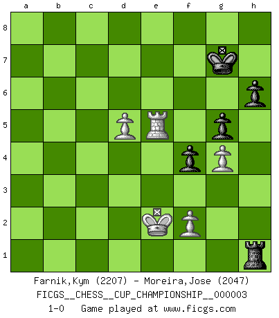 Last move : 1-0 2020 September 3 9:34:5 [Event "FICGS__CHESS__CUP_CHAMPIONSHIP__000003"] [Site "FICGS"] [Date "2020.07.01"] [Round "1"] [White "Farnik,Kym"] [Black "Moreira,Jose"] [Result "1-0"] [WhiteElo "2207"] [BlackElo "2047"] 1.d4 Nf6 2.Bf4 e6 3.Nf3 c5 4.e3 Nc6 5.Nbd2 cxd4 6.exd4 Nh5 7.Be3 Nf6 8.c3 Be7 9.Bd3 O-O 10.O-O Nd5 11.Qe2 f5 12.Nc4 b5 13.Nce5 Nxe5 14.Nxe5 Bf6 15.Bd2 d6 16.Nf3 Nc7 17.a4 bxa4 18.Rxa4 a6 19.Rfa1 Rb8 20.Bc1 Re8 21.Ra5 Kh8 22.h3 Bb7 23.Ne1 Qd7 24.Qh5 g6 25.Qe2 Qc6 26.Bf4 Rbd8 27.Nf3 Rb8 28.h4 Qd7 29.Bh6 Bxf3 30.Qxf3 Rxb2 31.Bxa6 Bxh4 32.Be2 Bd8 33.Bd1 Rg8 34.Ba4 Qc8 35.Qc6 Qb8 36.Qd7 Rb1+ 37.Bd1 g5 38.g3 Ne8 39.Ra7 Bc7 40.Qxe6 Rxd1+ 41.Rxd1 Qxa7 42.Re1 Bd8 43.Qxe8 f4 44.g4 Qc7 45.Re4 Qc8 46.Qe6 Qxe6 47.Rxe6 Rg6 48.Re8+ Rg8 49.Re2 Rg6 50.Re8+ Rg8 51.Re4 Rg6 52.Kg2 Ba5 53.Re8+ Rg8 54.Re6 Bxc3 55.Rxd6 Bb4 56.Rd5 Be7 57.Kf3 Rg6 58.Rd7 Rxh6 59.Rxe7 Rh1 60.Ke2 Rh6 61.Kd3 Rh1 62.Re5 h6 63.d5 Kg7 64.Ke2 1-0 Queen's pawn game Kingside Castling by player Black (move 9) Kingside Castling by player White (move 10) 10 pieces endgame at move 59 : White KRPPP , Black KRPPP WHITE : King + 1 Rook 3 Pawns BLACK : King + 1 Rook 3 Pawns Player White won this chess game. Follow this game move after move (download)Chess mastery essentially consists of analyzing Chess positions accurately. (Mikhail Botvinnik) Er war ein guter Schachspieler, aber ich kann Leute nicht ausstehen, die 'Heil Hitler' rufen (Über Alexander Aljechin). (Miguel Najdorf) El Ajedrez es 99 por ciento táctica. (Teichmann) Toutes les manuvres exécutées sur une colonne ouverte ont pour but ultime l'intrusion définitive sur la septième ou la huitième rangée, en plein cur de la position ennemie. (Aaron Nimzovitch) They say poker is a zero-sum game. It must be, because every time I play my sum ends up zero. (Max Shapiro)