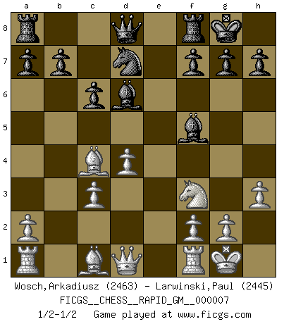 Last move : 1/2-1/2 2020 July 12 18:45:14 [Event "FICGS__CHESS__RAPID_GM__000007"] [Site "FICGS"] [Date "2020.07.02"] [Round "1"] [White "Wosch,Arkadiusz"] [Black "Larwinski,Paul"] [Result "1/2-1/2"] [WhiteElo "2463"] [BlackElo "2445"] 1.e4 e5 2.Nf3 Nf6 3.Nxe5 d6 4.Nf3 Nxe4 5.d4 d5 6.Bd3 Bd6 7.O-O O-O 8.c4 c6 9.Nc3 Nxc3 10.bxc3 dxc4 11.Bxc4 Bf5 12.h3 Nd7 1/2-1/2 Petrov : Classical attack, Marshall variation Kingside Castling by player White (move 7) Kingside Castling by player Black (move 7) This chess game ended in a draw. Follow this game move after move (download)Every Pawn is a potential Queen. (James Mason) Der Traum, für den ich lebe, ist der von einem freien Russland. Viele mögen sagen: Russland hat doch ein Parlament, einen gewählten Präsidenten. Aber ich spüre, dass in meiner Heimat die Angst wiederkehrt. Eine Angst, sich frei zu äußern, bestimmte Dinge zu tun (Garry Kasparov) Tu puedes aprender mucho mas de una partida que pierdas que de una partida ganada. Tendras que perder cientos de partidas antes de llegar a ser un buen jugador. (Jose Raul Capablanca) Les échecs sont plus proches de l'art de l'assassinat que de l'art de la guerre. (Arturo Perez-Reverte) The meaning of life is that it is to be lived, and it is not to be traded and conceptualized and squeezed into a pattern of systems. (Bruce Lee)