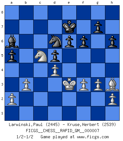 Last move : 1/2-1/2 2020 September 2 18:17:7 [Event "FICGS__CHESS__RAPID_GM__000007"] [Site "FICGS"] [Date "2020.07.02"] [Round "1"] [White "Larwinski,Paul"] [Black "Kruse,Herbert"] [Result "1/2-1/2"] [WhiteElo "2445"] [BlackElo "2539"] 1.d4 Nf6 2.Nf3 e6 3.g3 b5 4.Bg2 Bb7 5.O-O c5 6.Na3 Qa5 7.c4 bxc4 8.Nxc4 Qa6 9.b3 cxd4 10.Qxd4 Be7 11.Bb2 O-O 12.Rfc1 Nc6 13.Qd1 d5 14.Nce5 Rfc8 15.Nd3 Qb6 16.Nfe5 Nxe5 17.Nxe5 a5 18.Rxc8+ Rxc8 19.Rc1 Rxc1 20.Qxc1 h6 21.e3 Bd6 22.Qc3 Qb4 23.f3 Ne8 24.Bf1 f6 25.Nd3 Qb6 26.Qd4 Qc6 27.Qc3 Qb6 28.Qd4 Qc7 29.Qc3 Kf7 30.Kf2 Qb6 31.Qd4 Bc7 32.Qxb6 Bxb6 33.Bd4 Bxd4 34.exd4 Nd6 35.Bh3 Ke7 36.Ke3 Ba6 37.Nc5 1/2-1/2 Queen's pawn game Kingside Castling by player White (move 5) Kingside Castling by player Black (move 11) This chess game ended in a draw. Follow this game move after move (download)There's never before been a Chess player with such a thorough knowledge of the intricacies of the game and such an absolutely indomitable will to win. I think Bobby is the greatest player that ever lived. (Lisa Lane) Ich könnte leicht behaupten: Ja,ja, Leonid Breschnew wollte nicht, daß ich Weltmeister werde. In der Tat war die Sache komplizierter. (Viktor Kortschnoi) La pasion por jugar al Ajedrez es una de las mas inexplicables en el mundo. (H.G. Wells) Si le désir cupide (et stupide) de gagner est une inépuisable source de souffrance, une combinaison brillante sur l'échiquier est une découverte : le coquelicot qui s'épanouit lorsque apparaît la Voie Lactée. (Arrabal) Lottery : A tax on people who are bad at math. (Author unknown)