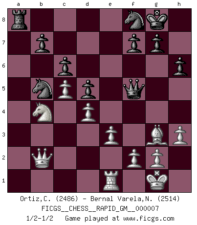 Last move : 1/2-1/2 2020 September 25 22:32:14 [Event "FICGS__CHESS__RAPID_GM__000007"] [Site "FICGS"] [Date "2020.07.02"] [Round "1"] [White "Ortiz,Clodomiro"] [Black "Bernal Varela,Nelson"] [Result "1/2-1/2"] [WhiteElo "2486"] [BlackElo "2514"] 1.d4 e6 2.c4 d5 3.Nc3 c6 4.cxd5 exd5 5.Bf4 Nf6 6.e3 Bf5 7.Nf3 Nbd7 8.h3 Be7 9.Bd3 Bxd3 10.Qxd3 O-O 11.O-O Re8 12.Qc2 Nb6 13.Rfc1 Nc4 14.b3 Nb6 15.a3 a5 16.Ne5 h6 17.Qb1 Bf8 18.b4 a4 19.Qf5 Nbd7 20.Bg3 Qe7 21.Rd1 Nb6 22.Rdb1 Rec8 23.Re1 Re8 24.Qc2 Qe6 25.Bh2 Nfd7 26.Nd3 Nc4 27.Nxa4 Qf5 28.Nac5 Bxc5 29.bxc5 Rxa3 30.Rxa3 Nxa3 31.Qb3 Nb5 32.Bg3 Ra8 33.Nb4 Nf8 34.Qb2 1/2-1/2 Queen's pawn Kingside Castling by player Black (move 10) Kingside Castling by player White (move 11) This chess game ended in a draw. Follow this game move after move (download)A strong memory, concentration, imagination, and a strong will is required to become a great Chess player. (Bobby Fischer) Vielleicht wirkt die Aura früherer Spieler glanzvoller als die der heutigen Spieler, aber das liegt daran, dass man kein Programm wie Fritz hatte, das einem all die Löcher in ihren Partien zeigt. (Vladimir Kramnik) Puntos débiles o agujeros en la posición de tu oponente deben de ser ocupados por piezas, no Peones. (Siegbert Tarrasch) On peut tirer plus d'utilité d'une partie perdue que de 100 parties gagnées. (Capablanca) Mandala - that's it! 16x16 squares as multiple of the four and the eight because of the Four Noble Truths and the Noble Eightfold Path. (Heinz-Georg Lehnhoff about Big Chess)