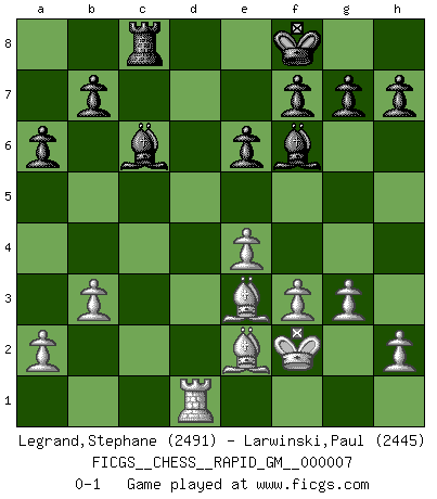 Last move : 0-1 2020 August 28 7:58:6 [Event "FICGS__CHESS__RAPID_GM__000007"] [Site "FICGS"] [Date "2020.07.02"] [Round "1"] [White "Legrand,Stephane"] [Black "Larwinski,Paul"] [Result "0-1"] [WhiteElo "2491"] [BlackElo "2445"] 1.d4 d5 2.c4 dxc4 3.e4 c5 4.Nf3 cxd4 5.Qxd4 Qxd4 6.Nxd4 Bd7 7.Bxc4 Nc6 8.Be3 e6 9.Nxc6 Bxc6 10.f3 Bd6 11.Nd2 Ne7 12.Kf2 O-O 13.Nb3 Rfc8 14.Rac1 Be5 15.Nd4 Bf6 16.b3 a6 17.Rhd1 Kf8 18.Be2 Be8 19.g3 Rxc1 20.Bxc1 Nc6 21.Nxc6 Bxc6 22.Be3 Rc8 0-1 QGA : 3.e4 Kingside Castling by player Black (move 12) Player Black won this chess game. Follow this game move after move (download)A bad day of Chess is better than any good day at work. (Anonymous) Wenn ein Kopf und ein Buch zusammenstoßen und es klingt hohl, ist es denn allemal im Buche? (Georg Christoph Lichtenberg) La captura del Rey enemigo es la finalidad pero no el primer objetivo de la partida. (William Steinitz) Toutes les manuvres exécutées sur une colonne ouverte ont pour but ultime l'intrusion définitive sur la septième ou la huitième rangée, en plein cur de la position ennemie. (Aaron Nimzovitch) It is the aim of the modern school, not to treat every position according to one general law, but according to the principle inherent in the position. (Richard Reti)