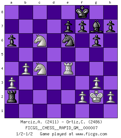 Last move : 1/2-1/2 2020 August 21 15:16:9 [Event "FICGS__CHESS__RAPID_GM__000007"] [Site "FICGS"] [Date "2020.07.02"] [Round "1"] [White "Marciz,Alexander"] [Black "Ortiz,Clodomiro"] [Result "1/2-1/2"] [WhiteElo "2411"] [BlackElo "2486"] 1.Nf3 Nf6 2.g3 d5 3.Bg2 c5 4.O-O g6 5.d4 cxd4 6.Nxd4 Bg7 7.c4 O-O 8.cxd5 Nxd5 9.Nc3 Nb6 10.Ndb5 Nc6 11.Bf4 Bf5 12.Qb3 Na5 13.Qd1 Nc6 14.Qc1 Nc4 15.Rd1 Qa5 16.a3 Rad8 17.b4 Rxd1+ 18.Qxd1 Qd8 19.Rc1 Qxd1+ 20.Nxd1 a6 21.Na7 Nd4 22.Rxc4 Nxe2+ 23.Kh1 Nxf4 24.Bxb7 Ne6 25.Be4 Bxe4+ 26.Rxe4 Rd8 27.Ne3 Rd2 28.Kg2 Kf8 29.Nc6 Ra2 30.Nc4 1/2-1/2 Reti Opening Kingside Castling by player White (move 4) Kingside Castling by player Black (move 7) This chess game ended in a draw. Follow this game move after move (download)Nowadays, when you're not a grandmaster at 14, you can forget about it. (Anand Viswanathan) Das Schach ist nichts für kleine Geister, es beansprucht einen vollen Mann, der sich nicht sklavisch an das Überlieferte hält, sondern selbständig die Tiefen des Spiels zu ergründen sucht. (Wilhelm Steinitz) Cualquier cambio de material en una posición debe venir por medio de un mate, una captura o promoción de Peón. (Purdy) Lorsque vous vous retrouvez devant une position atroce, ne tendez pas un ultime piège dérisoire avec l'intention d'abandonner si l'adversaire le déjoue ! Faites-vous plutôt un devoir de résister comme si votre vie en dépendait. Jouez le coup qui vous déplairait au centuple si vous étiez dans la peau de votre tortionnaire ! Wipe them out. All of them. (Darth Sidious in Star Wars ep.1)