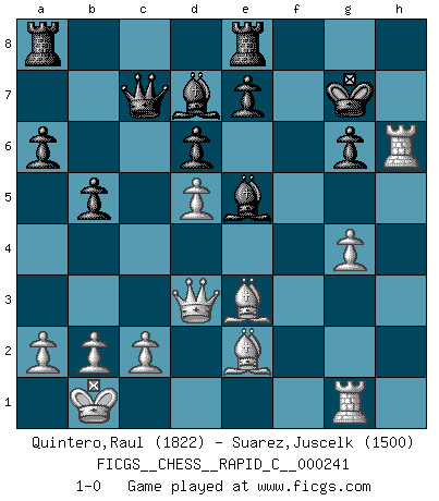 Last move : 1-0 2020 August 7 17:4:52 [Event "FICGS__CHESS__RAPID_C__000241"] [Site "FICGS"] [Date "2020.07.06"] [Round "1"] [White "Quintero,Raul"] [Black "Suarez,Juscelk"] [Result "1-0"] [WhiteElo "1822"] [BlackElo "1500"] 1.Nf3 c5 2.e4 d6 3.d4 cxd4 4.Nxd4 Nf6 5.Nc3 g6 6.Be3 Bg7 7.f3 O-O 8.Qd2 Re8 9.O-O-O a6 10.h4 h5 11.Kb1 b5 12.Bh6 Bh8 13.Bg5 Bd7 14.Be2 Nc6 15.Nxc6 Bxc6 16.Nd5 Nxd5 17.exd5 Bd7 18.g4 hxg4 19.fxg4 Qc8 20.Rdg1 Qc5 21.Be3 Qc7 22.h5 Be5 23.hxg6 fxg6 24.Qd3 Kg7 25.Rh6 1-0 Reti Opening Kingside Castling by player Black (move 7) Queenside Castling by player White (move 9) Player White won this chess game. Follow this game move after move (download)Spassky will not be psyched out by Fischer. (Mike Goodall) Ich war schon mal beim Dopingtest. Da musste ich Urin abgeben, während Dritte zusahen. (Elisabeth Pähtz) El juego de Fischer siempre fue nítido, racional y brillante. Uno de los mejores por siempre. (Dave Regis) Nous sommes les pions de la mystérieuse partie d'Echecs jouée par Dieu. Il nous déplace, nous arrête, nous pousse encore, puis nous lance un à un dans la boîte du Néant. Epitaphe sur la tombe de David Janowsky (1868-1927). If you have any trouble condescending, find a Unix user to show you how it's done. (Scott Adams)