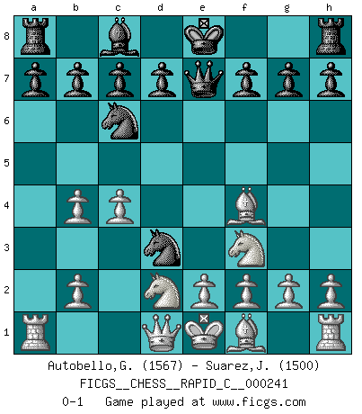 Last move : 0-1 2020 August 3 19:18:34 [Event "FICGS__CHESS__RAPID_C__000241"] [Site "FICGS"] [Date "2020.07.06"] [Round "1"] [White "Autobello,Giovanni"] [Black "Suarez,Juscelk"] [Result "0-1"] [WhiteElo "1567"] [BlackElo "1500"] 1.d4 Nf6 2.c4 e5 3.dxe5 Ng4 4.Nf3 Nc6 5.Bf4 Bb4+ 6.Nbd2 Qe7 7.a3 Ngxe5 8.axb4 Nd3+ 0-1 Comment by player 1 : Giovanni Autobello : What a awful blunder Budapest : Adler variation Player Black won this chess game. Follow this game move after move (download)We like to think. (Gary Kasparov) Auf Remis zu spielen ist gewissermaßen ein Verbrechen gegen das Schachspiel. (Mikhail Nekhemyevich Tal) Un jugador que trata de regresar una movida en el Ajedrez es un futuro carterista. (Richard Fenton) C'est une question de caractère, Beaucoup de gens perdent leur motivation très vite. D'autres, ils sont rares, peuvent la conserver très longtemps. J'aime les échecs, encore aujourd'hui je suis heureux d'analyser des parties. J'aime toujours gagner, je déteste encore perdre. Bien jouer est important pour mon intégrité intellectuelle et morale. Et puis les échecs vivent en ce moment une période historique grâce à Internet. Ils se développent dans les systèmes éducatifs à travers le monde. Ils sortent de leur ghetto, et c'est mon rôle de mener à bien cette révolution. (Gary Kasparov) The human is the only animal species whose members are able to talk themselves into difficulties that would not otherwise exist. (Wendell Johnson)