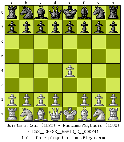 Last move : 1-0 2020 August 6 12:44:39 [Event "FICGS__CHESS__RAPID_C__000241"] [Site "FICGS"] [Date "2020.07.06"] [Round "1"] [White "Quintero,Raul"] [Black "Nascimento,Lucio"] [Result "1-0"] [WhiteElo "1822"] [BlackElo "1500"] 1.e4 1-0 This chess game has been lost on time (started : 2020.07.06 23:3:45) King's pawn Opening Player White won this chess game. Follow this game move after move (download)Not only will I predict his triumph over Botvinnik, but I'll go further and say that he'll probably be the greatest Chess player that ever lived. (John Collins) Kann Schach nicht schließlich das Nationalspiel der Deutschen werden? Und welche weiteren Ausblicke bieten sich dann dar! Welche Hebung des allgemeinen Kultur-Niveaus, ja der Moral, wenn das Schachbrett den Kartentisch verdrängen würde! Wahrlich, ein Ziel, des Schweißes der Edlen wert! (Siegbert Tarrasch) Alekhine es un poeta que crea un trabajo de arte de algo que raramente inspiraría a otra persona a mandar una tarjeta postal. (Max Euwe) Il s'avisa de me proposer d'apprendre les échecs qu'il jouait un peu... me voilà forcené des échecs. J'achète un échiquier, je m'enferme dans ma chambre, j'y passe des jours et des nuits à vouloir apprendre par cur toutes les parties. (Jean-Jacques Rousseau, Confessions) Watch your thoughts; they become words. Watch your words; they become actions. Watch your actions; they become habits. Watch your habits; they become character. Watch your character; it becomes your destiny. (Frank Outlaw)