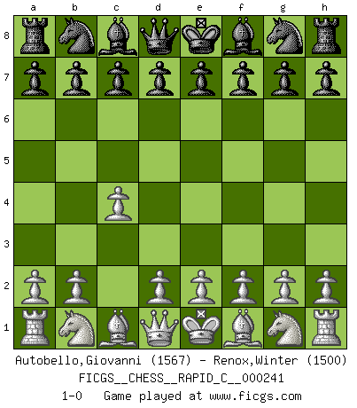 Last move : 1-0 2020 August 6 12:44:39 [Event "FICGS__CHESS__RAPID_C__000241"] [Site "FICGS"] [Date "2020.07.06"] [Round "1"] [White "Autobello,Giovanni"] [Black "Renox,Winter"] [Result "1-0"] [WhiteElo "1567"] [BlackElo "1500"] 1.c4 1-0 This chess game has been lost on time (started : 2020.07.06 23:3:45) English Opening Player White won this chess game. Follow this game move after move (download)A sacrifice is best refuted by accepting it. (Wilhelm Steinitz) Kasparov stellt für gewöhnlich die Regeln auf und bricht sie dann selbst wieder. (Alexej Shirov) Un Peón pasado aumenta su poder a medida de que el número de piezas en el tablero disminuye. (Capablanca) Botvinnik disait en comparant les échecs à la musique: Il existe une science dont le but est l'étude de l'acoustique et des sons. Mais il y a aussi un art qui se sert de l'océan des sons : c'est la musique. De toute évidence, il en est de même pour la pensée. La logique est l'étude des lois de la réflexion et les échecs reflètent, en tant qu'art, le côté logique de la réflexion, sous la forme d'images artistiques... Extrait de Fischer - Spassky, Reykjavik 1972 par Alexander & F. Wyndham (Ed. Solar), p 37. However beautiful the strategy, you should occasionally look at the results. (Winston Churchill)
