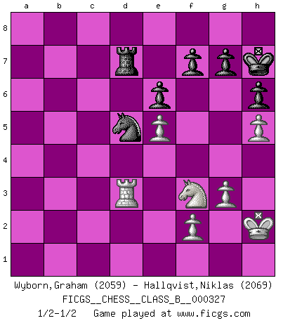 Last move : 1/2-1/2 2020 August 16 22:47:43 [Event "FICGS__CHESS__CLASS_B__000327"] [Site "FICGS"] [Date "2020.07.07"] [Round "1"] [White "Wyborn,Graham"] [Black "Hallqvist,Niklas"] [Result "1/2-1/2"] [WhiteElo "2059"] [BlackElo "2069"] 1.d4 e6 2.e4 d5 3.Nc3 Bb4 4.e5 c5 5.a3 Bxc3+ 6.bxc3 Nc6 7.Qg4 Kf8 8.Nf3 Qa5 9.Bd2 Qa4 10.Ra2 Nge7 11.Bd3 Ng6 12.O-O b6 13.Qg5 Ba6 14.dxc5 bxc5 15.Be3 d4 16.cxd4 cxd4 17.Bd2 h6 18.Qg3 Bxd3 19.cxd3 Qb3 20.R2a1 Qxd3 21.Bb4+ Nxb4 22.axb4 Kg8 23.Rfd1 Qb5 24.h4 d3 25.h5 Ne7 26.Qg4 Rd8 27.Rxa7 Nc6 28.Ra3 Qxb4 29.Qxb4 Nxb4 30.Rb3 Nd5 31.R1xd3 Rd7 32.Rb8+ Kh7 33.Rxh8+ Kxh8 34.Kh2 Kh7 35.g3 1/2-1/2 Queen's pawn Kingside Castling by player White (move 12) This chess game ended in a draw. Follow this game move after move (download)Only sissies Castle. (Rob Sillars) Über Kasparov: Es ist offensichtlich, daß er in einem totalitären Staat aufwuchs und deshalb zu diktatorischen Zügen neigt. (Viktor Kortschnoi) Siempre es mucho mejor sacrificar las piezas de tu oponente. (Savielly Tartakover) Horreur, mais aussi harmonie suprême : qu'y avait-il en effet au monde en dehors des échecs ? Le brouillard, l'inconnu, le non-être... (Vladimir Nabokov) The real voyage of discovery consists not in seeking new lands but in seeing with new eyes. (Marcel Proust)