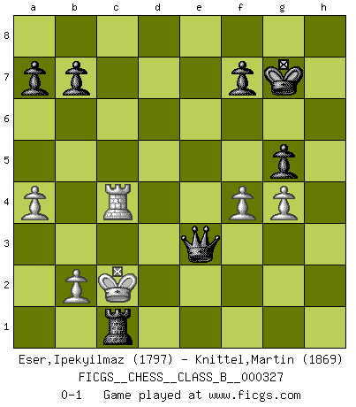 Last move : 0-1 2021 July 20 5:43:56 [Event "FICGS__CHESS__CLASS_B__000327"] [Site "FICGS"] [Date "2020.07.07"] [Round "1"] [White "Eser,Ipekyilmaz"] [Black "Knittel,Martin"] [Result "0-1"] [WhiteElo "1797"] [BlackElo "1869"] 1.a3 c5 2.g3 Nc6 3.Bg2 d5 4.d3 e5 5.c3 h6 6.a4 Nf6 7.Na3 Bf5 8.h3 Qd7 9.Bd2 Be7 10.h4 Rd8 11.Nh3 c4 12.d4 exd4 13.cxd4 Nxd4 14.Bxh6 Ne6 15.Bg5 Ne4 16.Bxe7 Qxe7 17.Bxe4 Bxe4 18.f3 Bf5 19.Kf1 Nc5 20.Qe1 d4 21.g4 Be6 22.Nf4 O-O 23.h5 d3 24.h6 d2 25.Qd1 g5 26.Nxe6 Qxe6 27.Qc2 Rfe8 28.h7+ Kg7 29.Qd1 Kh8 30.Rh2 Nb3 31.Rb1 Qe5 32.Rg2 Qf4 33.Nc2 Kxh7 34.Kg1 Kg7 35.e3 Rxe3 36.Nxe3 Qxe3+ 37.Rf2 Nc1 38.Kf1 Qf4 39.Rxd2 Rxd2 40.Rxc1 Rh2 41.Rxc4 Rh1+ 42.Kf2 Qh2+ 43.Ke3 Rxd1 44.f4 Qg3+ 45.Ke2 Re1+ 46.Kd2 Qe3+ 47.Kc2 Rc1+ 0-1 Follow this game move after move (download)Excellence at Chess is one mark of a scheming mind. (Sir Arthur Conan Doyle) Das Schachspiel hat wie die Liebe, die Musik, die Fähigkeit, den Menschen glücklich zu machen. Ich habe ein leises Gefühl des Bedauerns für jeden, der das Schachspiel nicht kennt, so wie ich jeden bedaure, der die Liebe nicht kennt. (Siegbert Tarrasch) El Ajedrez es un regaderazo frío para la mente. (Sir John Simon) J'apprécie les joueurs d'est-indienne, c'est grâce à eux que je nourris ma famille depuis tant d'années. (Petrosian) A specialist learns more and more about less and less until he knows everything about nothing. (Nicholas Murray Butler)