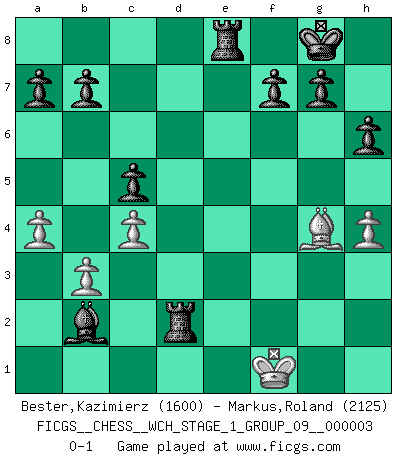 Last move : 0-1 2007 November 9 6:59:17 [Event "FICGS__CHESS__WCH_STAGE_1_GROUP_09__000003"] [Site "FICGS"] [Date "2007.07.11"] [Round "1"] [White "Bester,Kazimierz"] [Black "Markus,Roland"] [Result "0-1"] [WhiteElo "1600"] [BlackElo "2125"] 1.e4 c6 2.d3 d5 3.e5 c5 4.c3 Nc6 5.Nf3 Bg4 6.Be2 Bxf3 7.Bxf3 Nxe5 8.Be2 e6 9.O-O Nf6 10.Bg5 h6 11.Bh4 Qb6 12.b3 Be7 13.a4 Ng6 14.Nd2 Nxh4 15.Rb1 O-O 16.c4 Rad8 17.g3 Nf5 18.Nf3 Qb4 19.Qc1 Rfe8 20.Ne5 Nd7 21.Nf3 Bf6 22.Ne1 Nd4 23.Bd1 Ne5 24.f4 Ng6 25.Rb2 e5 26.f5 Ne7 27.Nc2 Qc3 28.Bg4 e4 29.dxe4 dxe4 30.Nxd4 Bxd4+ 31.Kh1 Qxc1 32.Rxc1 Bxb2 33.Rf1 e3 34.h4 e2 35.Bxe2 Nxf5 36.Bg4 Nxg3+ 37.Kg2 Nxf1 38.Kxf1 Rd2 0-1 This chess game has been lost on time (started : 2007.07.11 17:2:47) Caro-Kann : Closed (Breyer) variation Kingside Castling by player White (move 9) Kingside Castling by player Black (move 15) Player Black won this chess game. Follow this game move after move (download)You are for me the Queen on d8 and I am the Pawn on d7 !! (Eduard Gufeld) Der Knackpunkt bei der Konzentration ist, daß wir nur durch sie etwas Neues und Ungewöhnliches am Schachbrett finden können. Sie ist der einzige Weg durch neue neue Ideen eine Überraschung zu bereiten. (Garry Kasparov) El Ajedrez te enseña a controlarl la excitación inicial que sientes cuando vez algo que parece bueno y te enseña a pensar objetivamente cuando te encuentras en problemas. (Stanley Kubrick) Karpov est une pièce de musée. (Garry Kasparov) The only thing that overcomes hard luck is hard work. (Harry Golden)