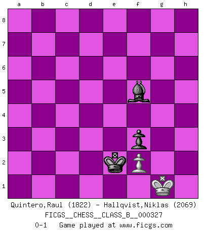 Last move : 0-1 2021 January 12 18:19:35 [Event "FICGS__CHESS__CLASS_B__000327"] [Site "FICGS"] [Date "2020.07.07"] [Round "1"] [White "Quintero,Raul"] [Black "Hallqvist,Niklas"] [Result "0-1"] [WhiteElo "1822"] [BlackElo "2069"] 1.e4 e6 2.d4 d5 3.exd5 exd5 4.Bd3 c5 5.dxc5 Bxc5 6.Nf3 Nf6 7.O-O Be6 8.Bg5 Nc6 9.Nbd2 O-O 10.c3 Re8 11.Qc2 h6 12.Bh4 Bb6 13.h3 g5 14.Bg3 Nh5 15.Bh2 Qf6 16.Bb5 Rac8 17.Rfe1 Nf4 18.Bxf4 Qxf4 19.Rad1 Bf5 20.Qa4 Rxe1+ 21.Rxe1 Qg3 22.Nd4 Bxd4 23.cxd4 Qf4 24.Nb3 Kg7 25.g3 Qd6 26.Bf1 b6 27.Rc1 a5 28.Nd2 Qb4 29.Qxb4 Nxb4 30.Rxc8 Bxc8 31.a3 Nc6 32.Bg2 Nxd4 33.Bxd5 b5 34.Kg2 Kf6 35.Nf3 Nxf3 36.Bxf3 Ke5 37.h4 gxh4 38.gxh4 Kf4 39.Be2 b4 40.axb4 axb4 41.Bh5 f6 42.Kf1 Bg4 43.Be8 Kf3 44.Bc6+ Kf4 45.Bd5 Bd1 46.Be6 Bg4 47.Bf7 Bf3 48.Be6 Ke4 49.Ke1 Kd3 50.Bb3 Bg4 51.Ba4 Be6 52.Kd1 Ke4 53.Ke2 Kf4 54.Be8 Bc4+ 55.Kd1 Kg4 56.h5 Kf4 57.Bg6 Kf3 58.Ke1 Be6 59.Kf1 Bg4 60.Bf7 Kf4 61.Kg2 Bf3+ 62.Kh2 Kg4 63.Be6+ Kh4 64.Bd7 Bxh5 65.Kg2 Be2 66.Be6 Kg5 67.Bf7 h5 68.Kg3 h4+ 69.Kg2 Bd3 70.Bb3 Bf5 71.Bd5 Kf4 72.Bc4 Be4+ 73.Kg1 Kf3 74.Kf1 Kf4 75.Be2 Ke5 76.Kg1 Kd4 77.Kh2 Bd3 78.Bd1 Bb5 79.Bc2 Bd7 80.Kg2 Bc6+ 81.Kh3 Be4 82.Ba4 Kd3 83.Kxh4 Kd2 84.Bd7 Kc2 85.Kg3 Kxb2 86.Be6 Kc3 87.Kf4 Bc2 88.Bd5 b3 89.Bxb3 Kxb3 90.Ke3 Kc3 91.Ke2 Kd4 92.Kd2 Be4 93.Ke2 f5 94.Kd2 f4 95.Ke2 f3+ 96.Kd2 Bf5 97.Kc1 Kc3 98.Kd1 Kd3 99.Ke1 Kc2 100.Kf1 Kd2 101.Kg1 Ke2 0-1 Follow this game move after move (download)Chess makes man wiser and clear-sighted. (Vladimir Putin) Rauchen ist dem Schachspieler bei seiner Arbeit, also im Wettkampf, untersagt. (Viktor Kortschnoi) Ciertamente el estado mental actual de Bobby Fischer es una tragedia. Uno de los mas grandes jugadores de Ajedrez del mundo -el orgullo y pena del Ajedrez Americano. (Frank Brady) Si rien de grave n'est détecté lors de l'analyse d'une position, on joue alors le coup. Seconde règle de Blumenfeld. It's not a bug - it's an undocumented feature. (Anonymous)