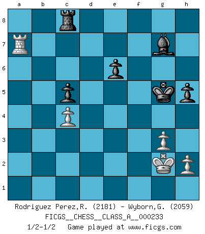 Last move : 1/2-1/2 2020 December 8 16:55:31 [Event "FICGS__CHESS__CLASS_A__000233"] [Site "FICGS"] [Date "2020.07.07"] [Round "1"] [White "Rodriguez Perez,Rene"] [Black "Wyborn,Graham"] [Result "1/2-1/2"] [WhiteElo "2181"] [BlackElo "2059"] 1.e4 c5 2.Nf3 d6 3.d4 cxd4 4.Qxd4 Nc6 5.Bb5 Bd7 6.Bxc6 Bxc6 7.c4 Nf6 8.Nc3 g6 9.Qd3 Bg7 10.O-O O-O 11.Rd1 Qb6 12.Nd4 Ng4 13.Qd2 Nf6 14.Qe2 Rfe8 15.Nxc6 bxc6 16.Rb1 Qa5 17.Bd2 Qe5 18.f3 Nd7 19.b3 Nc5 20.Rbc1 Qh5 21.g3 Ne6 22.Rf1 Rad8 23.Qd3 f5 24.Kg2 Rf8 25.exf5 Qxf5 26.Ne4 h5 27.Rce1 Rfe8 28.Nf2 Nd4 29.Rd1 Qxd3 30.Nxd3 c5 31.Nf4 Kf7 32.Nd5 Rd7 33.Rfe1 e6 34.Nc3 d5 35.Na4 dxc4 36.bxc4 Rc8 37.Be3 Rd6 38.a3 g5 39.Bxg5 Ra6 40.Nc3 Rxa3 41.Ne4 Kg6 42.Ra1 Rxa1 43.Rxa1 Nxf3 44.Rxa7 Nxg5 45.Nxg5 Kxg5 1/2-1/2 Follow this game move after move (download)The chessboard is the world, the pieces are the phenomena of the Universe, the rules of the game are what we call the laws of Nature and the player on the other side is hidden from us. (Thomas Huxley) Wenn Dein Gegner dir ein Remis anbietet, versuch herauszufinden, weshalb er glaubt schlechter zu stehen. (Nigel Short) Un mal día en el Ajedrez, es mejor que cualquier buen día en el trabajo. (Anonymous) Il vaut mieux sacrifier les pièces de l'adversaire. (Xavier Tartacover) Coffee just isn't my cup of tea. (Unknown)