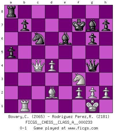 Last move : 0-1 2020 October 13 9:37:44 [Event "FICGS__CHESS__CLASS_A__000233"] [Site "FICGS"] [Date "2020.07.07"] [Round "1"] [White "Bovary,Charles"] [Black "Rodriguez Perez,Rene"] [Result "0-1"] [WhiteElo "2065"] [BlackElo "2181"] 1.d4 Nf6 2.c4 g6 3.Nc3 d5 4.cxd5 Nxd5 5.e4 Nxc3 6.bxc3 Bg7 7.Nf3 c5 8.Rb1 O-O 9.Be2 cxd4 10.cxd4 Qa5+ 11.Bd2 Qxa2 12.O-O a5 13.Qc1 Qe6 14.Bc4 Qxe4 15.Re1 Qg4 16.Rxe7 Nc6 17.Bxf7+ Rxf7 18.Rxf7 Kxf7 19.Qc4+ Be6 0-1 King's Indian defense, 3.Nc3 Kingside Castling by player Black (move 8) Kingside Castling by player White (move 12) Player Black won this chess game. Follow this game move after move (download)First-class players lose to second-class players because second-class players sometimes play a first-class game. (Siegbert Tarrasch) Schach sollte überall auf der Welt Schulfach werden. Es fördert die geistige Auseinandersetzung. Es lehrt die Demut in der Niederlage. (Garry Kasparov) Es el objetivo de la escuela moderna no tratar cada posición de acuerdo a una regla general, sino de acuerdo al principio inherente en la posición. (Richard Reti) Soyez une menace à chaque fois que vous vous asseyez pour jouer. (Ken Smith) Work expands to fill the time available. (C. Northcote Parkinson, in Parkinson's Laws)