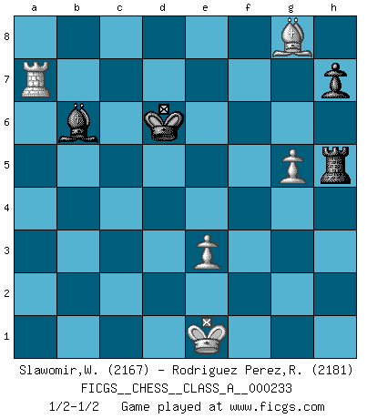 Last move : 1/2-1/2 2020 September 26 18:22:15 [Event "FICGS__CHESS__CLASS_A__000233"] [Site "FICGS"] [Date "2020.07.07"] [Round "1"] [White "Slawomir,Weglicki"] [Black "Rodriguez Perez,Rene"] [Result "1/2-1/2"] [WhiteElo "2167"] [BlackElo "2181"] 1.d4 Nf6 2.c4 g6 3.Nc3 d5 4.cxd5 Nxd5 5.e4 Nxc3 6.bxc3 Bg7 7.Nf3 c5 8.Be3 Bg4 9.Rc1 Bxf3 10.gxf3 O-O 11.d5 Nd7 12.f4 e5 13.dxe6 fxe6 14.e5 g5 15.fxg5 Nxe5 16.Qxd8 Raxd8 17.Bxc5 Rf4 18.Be3 Ra4 19.Rc2 Ng4 20.h4 Nxe3 21.fxe3 Rd5 22.c4 Re5 23.Rh3 Ra3 24.Rd2 Rf5 25.Rd8+ Rf8 26.Rxf8+ Kxf8 27.c5 Ke7 28.Bg2 a5 29.h5 Rxa2 30.Bxb7 a4 31.Rh4 Be5 32.c6 a3 33.Ra4 Rh2 34.Rxa3 Rxh5 35.Ra7 Bc7 36.Bc8 Kd6 37.Bxe6 Bb6 38.c7 Bxc7 39.Bg8 Bb6 1/2-1/2 King's Indian defense, 3.Nc3 Kingside Castling by player Black (move 10) 10 pieces endgame at move 37 : White KRBPPP , Black KRBP WHITE : King + 1 Rook 1 Bishop 3 Pawns BLACK : King + 1 Rook 1 Bishop 1 Pawn 9 pieces endgame at move 38 : White KRBPP , Black KRBP WHITE : King + 1 Rook 1 Bishop 2 Pawns BLACK : King + 1 Rook 1 Bishop 1 Pawn This chess game ended in a draw. Follow this game move after move (download)Chess is like war on a board. (Bobby Fischer) Das Schachspiel ist ein See, in welchem eine Mücke baden und ein Elefant ertrinken kann. (Emanuel Lasker) Solo los afeminados hacen el Enroque. (Rob Sillars) Le plus grand jeu de l'esprit jamais inventé, plus vous l'apprenez, plus vous y prenez du plaisir. (Garry Kasparov) Bobby never cared about money, though. His only desire was to prove that his choices were correct: He wanted chess to be important because he was a chess player, and he wanted to be important. Bobby knew money was important, but he didn't have a clue why, outside of clothes and status. The only way he could accomplish what he wanted was to fight for a lot of money. Once he got it, he gave it away. He did not know how to spend it. And once he'd become champion, after, essentially, sacrificing his life for it, he didn't know how to spend his time. (Bob Wade)