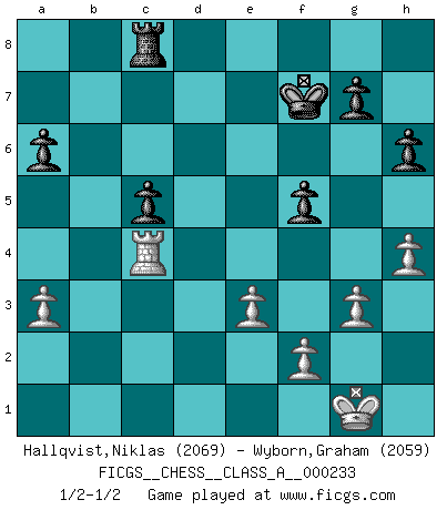 Last move : 1/2-1/2 2020 August 28 22:33:29 [Event "FICGS__CHESS__CLASS_A__000233"] [Site "FICGS"] [Date "2020.07.07"] [Round "1"] [White "Hallqvist,Niklas"] [Black "Wyborn,Graham"] [Result "1/2-1/2"] [WhiteElo "2069"] [BlackElo "2059"] 1.c4 e5 2.g3 Nf6 3.Bg2 d5 4.cxd5 Nxd5 5.Nc3 Nf6 6.a3 Bd6 7.Nf3 O-O 8.d4 exd4 9.Qxd4 Nc6 10.Qa4 h6 11.O-O Bd7 12.Nd4 Nxd4 13.Qxd4 Qe7 14.Bf4 Bc5 15.Qe5 c6 16.b4 Qxe5 17.Bxe5 Be7 18.b5 Rfd8 19.Rfd1 a6 20.bxc6 Bxc6 21.Bxc6 bxc6 22.Rdc1 c5 23.Bxf6 Bxf6 24.Ra2 Rd4 25.e3 Rc4 26.Rac2 Bxc3 27.Rxc3 Rxc3 28.Rxc3 Rc8 29.Rc4 f5 30.h4 Kf7 1/2-1/2 English Opening Kingside Castling by player Black (move 7) Kingside Castling by player White (move 11) This chess game ended in a draw. Follow this game move after move (download)It began to feel as though you were playing against Chess itself. - On playing against Robert Fischer. (Walter Shipman) Ich habe die Schachforschung dermaßen betrieben, dass sie auf eine wissenschaftliche Basis gestellt wurde. (Mikhail Moiseyevich Botvinik) El Ajedrez es un cuento de Hadas de las 1001 metidas de pata. (Savielly Tartakower) La solitude du joueur d'Echecs à l'approche du mat est semblable à celle du condamné. (Francis Szpiner) Life is pain my dear and anyone who says otherwise is selling something. (Princess Bride)