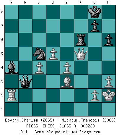 Last move : 0-1 2020 October 13 16:34:14 [Event "FICGS__CHESS__CLASS_A__000233"] [Site "FICGS"] [Date "2020.07.07"] [Round "1"] [White "Bovary,Charles"] [Black "Michaud,Francois"] [Result "0-1"] [WhiteElo "2065"] [BlackElo "2066"] 1.d4 d5 2.c4 e6 3.Nc3 c6 4.Nf3 dxc4 5.a4 Bb4 6.e3 b5 7.Bd2 a5 8.axb5 Bxc3 9.Bxc3 cxb5 10.b3 Bb7 11.bxc4 b4 12.Bb2 Nf6 13.Bd3 Nbd7 14.O-O O-O 15.Bc2 Qc7 16.Nd2 Rfe8 17.f3 h6 18.e4 e5 19.d5 Nc5 20.f4 Nfd7 21.Kh1 f6 22.fxe5 fxe5 23.Qh5 Re7 24.Nb3 Nxb3 25.Bxb3 Nc5 26.Bc2 a4 27.Qg6 Ra6 28.Qg3 a3 29.Bc1 Rf7 30.Rxf7 Qxf7 31.Be3 Rf6 32.Rg1 Qc7 33.Bb1 Bc8 34.h3 Bd7 35.Kh2 Ba4 36.Qe1 Qb6 37.Qg3 b3 38.Qxe5 a2 39.Bxa2 bxa2 40.Ra1 Rg6 41.Rxa2 Qb3 42.Qf5 Rf6 0-1 QGD : Semi-Slav, Abrahams variation Kingside Castling by player White (move 14) Kingside Castling by player Black (move 14) Player Black won this chess game. Follow this game move after move (download)I believe that Chess possesses a magic that is also a help in advanced age. A rheumatic knee is forgotten during a game of Chess and other events can seem quite unimportant in comparison with a catastrophe on the chessboard. (Vlastimil Hort) Vielleicht wirkt die Aura früherer Spieler glanzvoller als die der heutigen Spieler, aber das liegt daran, dass man kein Programm wie Fritz hatte, das einem all die Löcher in ihren Partien zeigt. (Vladimir Kramnik) Las leyes del Ajedrez no permiten una libre elección: tienes que mover quieras o no. (Emanuel Lasker) C'est la seule position que je connaisse où les deux camps sont mals. Propos prêtés à V. Anand. A clear conscience is usually the sign of a bad memory. (Unknown)