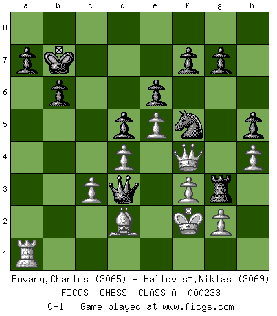 Last move : 0-1 2020 October 16 11:7:40 [Event "FICGS__CHESS__CLASS_A__000233"] [Site "FICGS"] [Date "2020.07.07"] [Round "1"] [White "Bovary,Charles"] [Black "Hallqvist,Niklas"] [Result "0-1"] [WhiteElo "2065"] [BlackElo "2069"] 1.e4 e6 2.d4 d5 3.Nc3 Bb4 4.e5 c5 5.a3 Bxc3+ 6.bxc3 Nc6 7.Qg4 Kf8 8.Nf3 Qa5 9.Bd2 Qa4 10.Be2 Nge7 11.Ra2 b6 12.h4 Ba6 13.Bxa6 h5 14.Qg5 Qxa6 15.dxc5 Qb5 16.Ra1 Qxc5 17.O-O Qc4 18.Nd4 Rh6 19.Rfe1 Rc8 20.Rab1 Nxd4 21.cxd4 Nf5 22.c3 Ke8 23.Rbd1 Kd7 24.Qf4 Qd3 25.f3 Rg6 26.Kh1 Rc4 27.Kg1 Kc8 28.Kf2 Rg3 29.Rc1 Kb7 30.Red1 Ka6 31.a4 Rxa4 32.Ra1 Rxa1 33.Rxa1+ Kb7 0-1 French : Winawer, Advance variation Kingside Castling by player White (move 17) Player Black won this chess game. Follow this game move after move (download)Half the variations which are calculated in a tournament game turn out to be completely superfluous. Unfortunately, no one knows in advance which half. (Jan Tinman) Ein Schachgenie ist jemand der verdammt gut Schach spielt. (Jonathan Levitt) ¿Se han dado cuenta de que Fischer casi nunca ha tenido piezas malas? El las intercambia y las piezas malas se quedan con sus oponenets. (Yuri Balashov) Le pion, dans sa simplicité, marche droit devant lui, mais lorsqu'il prend, il le fait obliquement? Ainsi l'homme, tant qu'il reste pauvre, marche dans la droiture et vit honnêtement, mais lorsqu'il recherche les honneurs, il flatte, se parjure et, par les voies obliques, cherche une position supérieure sur l'échiquier du monde. (Jean de Galles) When you have everything, sometimes it feels like nothing. (Horatio Caine, C.S.I. Miami)