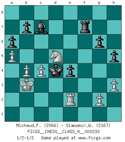 Last move : 1/2-1/2 2020 July 29 21:23:25 [Event "FICGS__CHESS__CLASS_A__000233"] [Site "FICGS"] [Date "2020.07.07"] [Round "1"] [White "Michaud,Francois"] [Black "Slawomir,Weglicki"] [Result "1/2-1/2"] [WhiteElo "2066"] [BlackElo "2167"] 1.e4 c5 2.Nf3 d6 3.d4 cxd4 4.Nxd4 Nf6 5.Nc3 g6 6.Be3 Bg7 7.f3 O-O 8.Qd2 Nc6 9.O-O-O d5 10.Kb1 Nxd4 11.e5 Nf5 12.exf6 exf6 13.Nxd5 Nxe3 14.Qxe3 Be6 15.Bc4 f5 16.Nc3 Qc8 17.Bxe6 Qxe6 18.Qxe6 fxe6 19.Nb5 Rf7 20.Rhe1 a6 21.Nd6 Re7 22.a4 Rd8 23.Rd3 Kf8 24.a5 e5 25.Red1 R8d7 26.c3 e4 27.fxe4 fxe4 28.Re3 Be5 29.Rf1+ Kg7 30.Nc8 Rf7 31.Rxf7+ Rxf7 32.h3 Rf4 33.Nb6 Kf7 34.Nc4 Bc7 35.Re2 Ke6 36.b4 h5 37.Kc2 Kd5 38.Ne3+ Ke5 39.c4 Kd4 40.Nd5 Rf7 41.Kb3 1/2-1/2 Sicilian : Dragon, Yugoslav attack, 7...O-O Kingside Castling by player Black (move 7) Queenside Castling by player White (move 9) This chess game ended in a draw. Follow this game move after move (download)As one by one I mowed them down, my superiority soon became apparent. (Jose Capablanca) Jeder Fehler erscheint unglaublich dumm, wenn andre ihn begehen. (Georg Christoph Lichtenberg) El sobresalir en el Ajedrez es un signo de una mente intrigante. (Sir Arthur Conan Doyle) Même un GMI sait rarement calculer sur plus de cinq coups une attaque à sacrifices. (Rudolf Spielmann) The Internet is the world's largest library. It's just that all the books are on the floor. (John Allen Paulos)