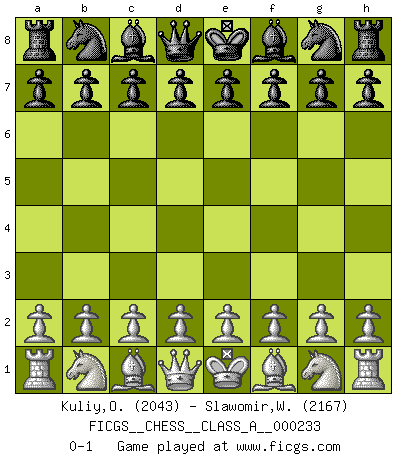 Last move : 0-1 2020 July 7 10:56:18 [Event "FICGS__CHESS__CLASS_A__000233"] [Site "FICGS"] [Date "2020.07.07"] [Round "1"] [White "Kuliy,Oleksandr"] [Black "Slawomir,Weglicki"] [Result "0-1"] [WhiteElo "2043"] [BlackElo "2167"] 0-1 Player Black won this chess game. Follow this game move after move (download)Chess is everything: art, science and sport. (Anatoly Karpov) Wer sich die Fähigkeit anerziehen will im Schach selbstständig zu denken, der muß alles meiden, was leblos ist: ausgeklügelte Theorien, die sich auf sehr wenige Beispiele und eine Menge Hirngespinste stützen. (Emanuel Lasker) Los asuntos humanos son como una partida de Ajedrez: solo aquellos que no lo toman seriamente, pueden ser llamados buenos jugadores. (Hung Tzu Ch'eng) J'ai vu le vaincu d'Echecs jouer des années durant dans l'espoir de la fête de la victoire. Car tu es plus riche de ce qu'elle existe si même elle n'est point pour toi. Ainsi de la perle du fond des mers. (Antoine de Saint-Exupéry) Creativity is inventing, experimenting, growing, taking risks, breaking rules, making mistakes, and having fun. (Mary Lou Cook)
