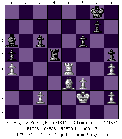 Last move : 1/2-1/2 2020 September 26 21:55:58 [Event "FICGS__CHESS__RAPID_M__000117"] [Site "FICGS"] [Date "2020.07.11"] [Round "1"] [White "Rodriguez Perez,Rene"] [Black "Slawomir,Weglicki"] [Result "1/2-1/2"] [WhiteElo "2181"] [BlackElo "2167"] 1.e4 e5 2.Nf3 Nc6 3.d4 exd4 4.Nxd4 Nf6 5.Nxc6 bxc6 6.Bd3 d5 7.Qe2 dxe4 8.Nc3 Bb4 9.Bxe4 O-O 10.Bxc6 Rb8 11.O-O Qd6 12.Bb5 Ng4 13.g3 Bxc3 14.bxc3 Ne5 15.Bf4 Rxb5 16.Qxb5 Nf3+ 17.Kg2 Qe6 18.Rfd1 c6 19.Qa4 Nh4+ 20.Kg1 Qh3 21.gxh4 Qg4+ 22.Kf1 Qf3 23.Rd3 Qh1+ 24.Ke2 Qxa1 25.Re3 Qb1 26.Qe4 Bg4+ 27.f3 Be6 28.a3 Bd5 29.Qd3 Qa2 30.Kf2 h6 31.c4 Bxc4 32.Qc3 f6 33.Re1 Bd5 34.Ra1 Qc4 35.Qxc4 Bxc4 36.Rb1 Bb5 37.Rb4 Re8 38.Be3 a5 39.Rg4 h5 40.Rf4 Re5 41.a4 Ba6 42.Re4 Rd5 1/2-1/2 Scotch : Schmidt variation Kingside Castling by player Black (move 9) Kingside Castling by player White (move 11) This chess game ended in a draw. Follow this game move after move (download)It's always better to sacrifice your opponent's men. (Savielly Tartakover) Schach ist das Spiel, das die Verrückten gesund hält. (Albert Einstein) Si pudieramos observar el interior de la cabeza de un jugador de Ajedrez, encontraríamos ahí un mundo lleno de sentimientos, imágenes, ideas, emoción y pasión. (Alfred Binet) Le plus grand jeu de l'esprit jamais inventé, plus vous l'apprenez, plus vous y prenez du plaisir. (Garry Kasparov) If you ain't just a little scared when you enter a casino, you are either very rich or you haven't studied the games enough. (Pappy)