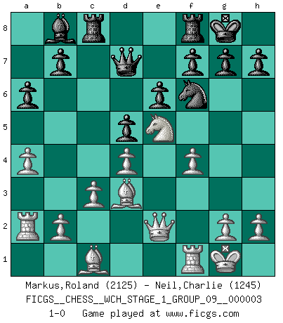 Last move : 1-0 2007 September 10 23:17:20 [Event "FICGS__CHESS__WCH_STAGE_1_GROUP_09__000003"] [Site "FICGS"] [Date "2007.07.11"] [Round "1"] [White "Markus,Roland"] [Black "Neil,Charlie"] [Result "1-0"] [WhiteElo "2125"] [BlackElo "1245"] 1.d4 d5 2.e3 Nf6 3.Bd3 e6 4.f4 c5 5.c3 cxd4 6.exd4 a6 7.Nf3 Be7 8.Ne5 O-O 9.Nd2 Bd7 10.a4 Nc6 11.O-O Bd6 12.Qe2 Rc8 13.Ndf3 Na5 14.Ra2 Nc4 15.Nxc4 Bb8 16.Nce5 Qe8 17.Nxd7 Qxd7 18.Ne5 1-0 Queen's pawn : Stonewall attack Kingside Castling by player Black (move 8) Kingside Castling by player White (move 11) Player White won this chess game. Follow this game move after move (download)Live, lose, and learn, by observing your opponent how to win. (Amber Steenbock) Die Jungen erwarten, dass Opa einfach umfällt. Dann aber kann Opa fünf Stunden lang Schach spielen und die jungen Gegner an die Wand drücken. (Viktor Kortschnoi) Yo adoro todas la posiciones. Denme una partida posicional difícil, y la jugaré. Pero posiciones totalmente ganadas, no las tolero. (Hein Donner) Le joueur d'Echecs qui veut atteindre le top est obligé de développer son propre credo créatif. Alexeï Stepanovicth Souétine. Il est facile d'écrire des livres ! Ce qui est difficile, c'est de jouer ! (Alexeï Stepanovicth Souétine) All men can see these tactics whereby I conquer, but what none can see is the strategy out of which victory is evolved. (Sun Tzu)