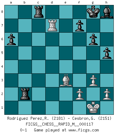 Last move : 0-1 2020 September 29 22:27:39 [Event "FICGS__CHESS__RAPID_M__000117"] [Site "FICGS"] [Date "2020.07.11"] [Round "1"] [White "Rodriguez Perez,Rene"] [Black "Cesbron,Guy"] [Result "0-1"] [WhiteElo "2181"] [BlackElo "2151"] 1.e4 c5 2.Nf3 d6 3.d4 cxd4 4.Qxd4 Nc6 5.Bb5 Bd7 6.Bxc6 Bxc6 7.c4 Nf6 8.Nc3 g6 9.O-O Bg7 10.Re1 O-O 11.Qd2 Rc8 12.Rb1 a6 13.Nd4 Qb6 14.Nxc6 Qxc6 15.b3 b5 16.Nd5 Nxd5 17.exd5 Qc7 18.Qd3 bxc4 19.bxc4 Qxc4 20.Qxc4 Rxc4 21.Rxe7 Rd4 22.Be3 Rxd5 23.g3 Ra5 24.Rd7 Rxa2 25.Rxd6 Ra8 26.Rb7 h5 27.R6d7 Rb2 28.Rbc7 Be5 29.Rc5 Bh8 30.Rc8+ Rxc8 0-1 Sicilian, Chekhover variation Kingside Castling by player White (move 9) Kingside Castling by player Black (move 10) Player Black won this chess game. Follow this game move after move (download)Chess mastery essentially consists of analyzing Chess positions accurately. (Mikhail Botvinnik) Ich habe die besten Aussichten, den ersten Preis zu gewinnen - denn jeder muss gegen Steinitz spielen, nur ich nicht! (Wilhelm Steinitz) En la perfecta combinación de Ajedrez como en una historia corta de primera clase, toda la trama y contra trama deberá conducir hacia un final sorprendente, el interes no es mitigado hasta el último momento. (Yates and Winter) Les échecs sont utiles à l'exercice de la faculté de penser et à celle de l'imagination. Car nous devons posséder une méthode élaborée pour atteindre des buts partout où nous devons conduire notre raison. (Leibnitz) Waiting for chance ? Play in casinos. (FICGS proverb)