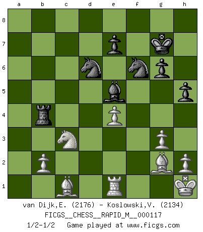 Last move : 1/2-1/2 2020 November 17 18:45:22 [Event "FICGS__CHESS__RAPID_M__000117"] [Site "FICGS"] [Date "2020.07.11"] [Round "1"] [White "van Dijk,Erik L."] [Black "Koslowski,Volker"] [Result "1/2-1/2"] [WhiteElo "2176"] [BlackElo "2134"] 1.d4 g6 2.c4 Nf6 3.Nc3 d5 4.Nf3 Bg7 5.Qb3 dxc4 6.Qxc4 O-O 7.e4 a6 8.Qb3 b5 9.Be2 c5 10.dxc5 Be6 11.Qc2 Nbd7 12.Be3 Rc8 13.Rd1 Qa5 14.a3 b4 15.axb4 Qxb4 16.c6 Rxc6 17.Nd4 Rd6 18.Nxe6 Rxd1+ 19.Bxd1 fxe6 20.O-O Rb8 21.Bf4 Rb7 22.Bc1 Rc7 23.Bd2 Ne8 24.Be2 Qb7 25.Bg4 Kf7 26.f4 Bd4+ 27.Kh1 Nd6 28.f5 Nf6 29.fxe6+ Kg7 30.Bf3 Be5 31.Qc1 Qb3 32.Bh6+ Kh8 33.Qa1 Qxe6 34.Qxa6 Rb7 35.Qa8+ Qg8 36.Qa5 Nf7 37.Bc1 Qb8 38.g3 Kg7 39.Bg2 h5 40.Qa6 Rb4 41.Qe6 Qd6 42.Qxd6 Nxd6 43.Re1 1/2-1/2 Follow this game move after move (download)On the chessboard, lies and hypocrisy do not survive long. (Emanuel Lasker) Das Schachspiel ist ein See, in welchem eine Mücke baden und ein Elefant ertrinken kann. (Emanuel Lasker) No solamente yo pronostico su triunfo sobre Botvinnik, sino que me adelanto y digo que probablemente Fischer es el jugador de Ajedrez mas grande que haya existido. (John Collins) Pour moi, les échecs ne sont pas un jeu mais un art. (Alexandre Alekhine) He who fights with monsters should be careful lest he thereby become a monster. (Friedrich Nietzsche, Beyond Good and Evil)