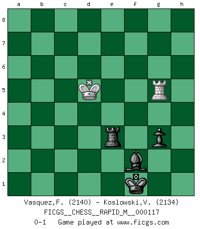 Last move : 0-1 2021 February 8 15:6:39 [Event "FICGS__CHESS__RAPID_M__000117"] [Site "FICGS"] [Date "2020.07.11"] [Round "1"] [White "Vasquez,Fernando"] [Black "Koslowski,Volker"] [Result "0-1"] [WhiteElo "2140"] [BlackElo "2134"] 1.e4 g6 2.Nf3 Bg7 3.Bc4 c5 4.c3 e6 5.O-O Ne7 6.d4 cxd4 7.Nxd4 O-O 8.Re1 d5 9.exd5 Nxd5 10.Nd2 h6 11.N2f3 Nc6 12.Bb3 Nxd4 13.Nxd4 Qa5 14.Bd2 Qc5 15.Qc1 Kh7 16.Re4 Rd8 17.Nf3 Qf8 18.Rh4 Bd7 19.Bc2 Ne7 20.Bf4 Rac8 21.Ne5 Be8 22.Ng4 Ng8 23.Qe3 b5 24.a3 a5 25.g3 b4 26.axb4 axb4 27.Ra7 Rd7 28.Rxd7 Bxd7 29.Be5 bxc3 30.bxc3 Be8 31.c4 f6 32.Bc3 e5 33.Bd3 Bc6 34.f3 Re8 35.c5 Ra8 36.Bd2 Ra2 37.Bc4 Ra1+ 38.Kf2 g5 39.Rh3 Kh8 40.Rh5 Be8 41.Rh3 Bd7 42.Bc3 Ra3 43.Ke1 Qc8 44.Rh5 Be6 45.Bxe6 Qxe6 46.Qc1 Qb3 47.Bb2 Ra2 48.c6 Qxb2 49.Qxb2 Rxb2 50.Ne3 Rb1+ 51.Kd2 Rb8 52.Nf5 Rc8 53.Kd3 Rxc6 54.h4 Kh7 55.hxg5 fxg5 56.Rh1 Kg6 57.g4 Bf8 58.Rh2 Nf6 59.Rxh6+ Kf7 60.Rh2 Ra6 61.Rc2 Ke6 62.Rc8 Bd6 63.Ke2 e4 64.fxe4 Bf4 65.Nh6 Nxe4 66.Kf3 Nd6 67.Rf8 Ra3+ 68.Kg2 Ra2+ 69.Kf3 Ra1 70.Nf5 Nxf5 71.gxf5+ Ke7 72.Rc8 Rc1 73.Rg8 Kf7 74.Ra8 Kf6 75.Rf8+ Kg7 76.Re8 Kf7 77.Re6 Rg1 78.Kf2 Rd1 79.Kf3 Rd6 80.Re1 Rd3+ 81.Ke4 Rh3 82.Ra1 Re3+ 83.Kd5 Kf6 84.Ra8 Kxf5 85.Rf8+ Kg4 86.Rh8 Kf3 87.Rh3+ Bg3 88.Rh5 g4 89.Rh7 Bf2 90.Rf7+ Ke2 91.Rf5 g3 92.Rg5 Kf1 0-1 Follow this game move after move (download)The tactician knows what to do when there is something to do; whereas the strategian knows what to do when there is nothing to do. (Gerald Abrahams) Verschiedene, sehr schätzbare und im Laufe des Lebens nützliche Eigenschaften des Geistes können durch das Schachspiel erworben und gekräftigt werden, so dass sie zu Gewohnheiten werden, die uns nie im Stich lassen. (Benjamin Franklin) En posiciones complicadas, Bobby Fischer pocas veces tuvo que temer de cualquiera. (Paul Keres) On n'a jamais que l'âge auquel on a commence à jouer aux échecs car après on cesse de vieillir. (Capablanca) Men should grow up. - Yeah. And dogs should stop licking themselves. It's not gonna happen. (Gregory House to Dr. Cameron, House M.D.)