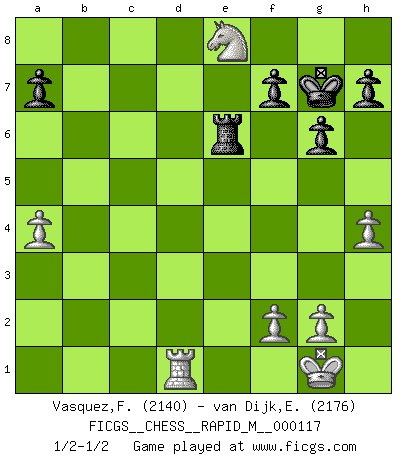 Last move : 1/2-1/2 2020 October 12 3:40:58 [Event "FICGS__CHESS__RAPID_M__000117"] [Site "FICGS"] [Date "2020.07.11"] [Round "1"] [White "Vasquez,Fernando"] [Black "van Dijk,Erik L."] [Result "1/2-1/2"] [WhiteElo "2140"] [BlackElo "2176"] 1.e4 c5 2.c3 Nf6 3.e5 Nd5 4.Nf3 Nc6 5.d4 cxd4 6.cxd4 d6 7.Bc4 Nb6 8.Bb5 Bd7 9.Nc3 dxe5 10.dxe5 g6 11.Qe2 Bg7 12.O-O O-O 13.Rd1 Qc7 14.a4 Nxe5 15.Bxd7 Nbxd7 16.Nd5 Nxf3+ 17.Qxf3 Qe5 18.Bf4 Qxb2 19.Rab1 Qa2 20.Rxb7 Nc5 21.Rb5 Ne6 22.Be5 Bxe5 23.Nxe7+ Kg7 24.Rxe5 Qb2 25.R5e1 Rfe8 26.h4 Qf6 27.Qxf6+ Kxf6 28.Nd5+ Kg7 29.Rxe6 Rxe6 30.Nc7 Rae8 31.Nxe8+ 1/2-1/2 Sicilian : Alapin's variation (2.c3) Kingside Castling by player White (move 12) Kingside Castling by player Black (move 12) This chess game ended in a draw. Follow this game move after move (download)Chess is a terrible game. If you have no center, your opponent has a freer position. If you do have a center, then you really have something to worry about ! (Siegbert Tarrasch) Der vorletzte Fehler gewinnt. (Savielly Grigorievitsch Tartakower) Debemos de asegurarnos de que el Ajedrez no se convierta en un lenguaje muerto, muy interesante, pero solo para un grupo muy pequeño. (Sytze Faber) Le joueur d'Echecs qui veut atteindre le top est obligé de développer son propre credo créatif. Alexeï Stepanovicth Souétine. Il est facile d'écrire des livres ! Ce qui est difficile, c'est de jouer ! (Alexeï Stepanovicth Souétine) Knowledge will give you power, but character respect. (Bruce Lee)