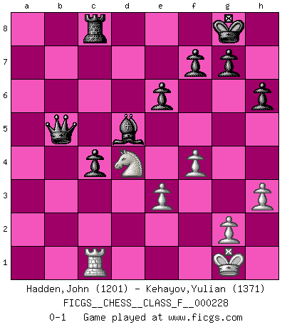Last move : 0-1 2020 September 28 1:27:27 [Event "FICGS__CHESS__CLASS_F__000228"] [Site "FICGS"] [Date "2020.07.13"] [Round "1"] [White "Hadden,John"] [Black "Kehayov,Yulian"] [Result "0-1"] [WhiteElo "1201"] [BlackElo "1371"] 1.d4 Nf6 2.Nf3 e6 3.e3 b6 4.Nc3 Bb7 5.Bd3 h6 6.Bd2 Be7 7.a3 O-O 8.O-O d5 9.b4 a6 10.Ne2 c5 11.bxc5 bxc5 12.dxc5 Bxc5 13.Bb4 Bxb4 14.axb4 Nc6 15.c3 Ng4 16.h3 Nge5 17.Nxe5 Nxe5 18.f4 Nxd3 19.Qxd3 Qb6 20.Nd4 a5 21.Rxa5 Rxa5 22.bxa5 Qxa5 23.c4 dxc4 24.Qb1 Bd5 25.Rc1 Rc8 26.Qb5 Qxb5 0-1 Queen's pawn : Yusupov-Rubinstein system Kingside Castling by player Black (move 7) Kingside Castling by player White (move 8) Player Black won this chess game. Follow this game move after move (download)Chess is a foolish expedient for making idle people believe they are doing something very clever when they are only wasting their time. (George Bernard Shaw) Versuche, dich von der Sklaverei der Eröffnungsvarianten zu befreien. Stattdessen soll man gewisse Typenpositionen erlernen, die man eingehend analysiert. (Aaron Nimzowitsch) El jugador táctico sabe que hacer cuando hay algo que hacer; mientras que el estratega sabe que hacer cuando no hay nada que hacer. (Gerald Abrahams) Avant la finale, les dieux ont créé le milieu de partie. (Tarrasch) There is a great deal of difference between an eager man who wants to read a book and a tired man who wants a book to read. (G.K. Chesterton)
