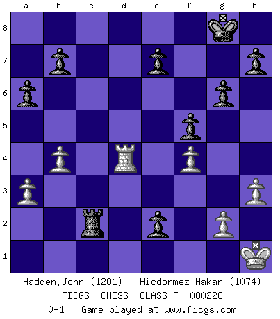 Last move : 0-1 2020 September 5 12:23:45 [Event "FICGS__CHESS__CLASS_F__000228"] [Site "FICGS"] [Date "2020.07.13"] [Round "1"] [White "Hadden,John"] [Black "Hicdonmez,Hakan"] [Result "0-1"] [WhiteElo "1201"] [BlackElo "1074"] 1.d4 Nf6 2.Nf3 d5 3.e3 Bf5 4.Bd3 Bxd3 5.Qxd3 Nbd7 6.Nc3 c5 7.a3 cxd4 8.exd4 a6 9.O-O g6 10.Bd2 Bg7 11.b4 O-O 12.Ne2 Rc8 13.Rac1 Nb6 14.Ne5 Ne4 15.f4 f6 16.Nf3 Nc4 17.Nc3 Ncxd2 18.Nxd2 Rxc3 19.Qe2 f5 20.Nxe4 dxe4 21.Qd2 Qxd4+ 22.Qxd4 Bxd4+ 23.Kh1 Rfc8 24.Rfd1 Rxc2 25.Rxc2 Rxc2 26.h3 e3 27.Rxd4 e2 0-1 Queen's pawn game Kingside Castling by player White (move 9) Kingside Castling by player Black (move 11) Player Black won this chess game. Follow this game move after move (download)The enormous mental resilience, without which no Chess player can exist, was so much taken up by Chess that he could never free his mind of this game. (Albert Einstein) Nie in meinem Leben habe ich die französische Verteidigung gespielt, welche die Stumpfsinnigste von allen ist. (Wilhelm Steinitz) No solamente yo pronostico su triunfo sobre Botvinnik, sino que me adelanto y digo que probablemente Fischer es el jugador de Ajedrez mas grande que haya existido. (John Collins) Celui qui prend des risques peut perdre, celui qui n'en prend pas perd toujours. (Xavier Tartacover) A good programmer is someone who always looks both ways before crossing a one-way street. (Doug Linder)