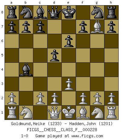 Last move : 1-0 2020 July 23 16:44:20 [Event "FICGS__CHESS__CLASS_F__000228"] [Site "FICGS"] [Date "2020.07.13"] [Round "1"] [White "Goldmund,Heike"] [Black "Hadden,John"] [Result "1-0"] [WhiteElo "1233"] [BlackElo "1201"] 1.b4 d5 2.Bb2 e6 3.e3 Bxb4 4.Bxg7 1-0 Polish (Sokolsky) opening Player White won this chess game. Follow this game move after move (download)It is the aim of the modern school, not to treat every position according to one general law, but according to the principle inherent in the position. (Richard Reti) Ich glaube nicht an Psychologie, ich glaube an gute Züge. (Robert James Fischer) No es tiempo de jugar al Ajedrez cuando la casa esta en llamas. (Proverbio Italiano) Le système Elo représente seulement une moyenne. Il est simplement un indicateur de votre stabilité. (Anatoli Karpov) Pretend inferiority and encourage his arrogance. (Sun Tzu)