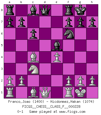 Last move : 0-1 2020 September 3 18:23:13 [Event "FICGS__CHESS__CLASS_F__000228"] [Site "FICGS"] [Date "2020.07.13"] [Round "1"] [White "Franco,Joao"] [Black "Hicdonmez,Hakan"] [Result "0-1"] [WhiteElo "1400"] [BlackElo "1074"] 1.d4 Nf6 2.c4 e6 3.Nf3 d5 4.e3 c6 5.Bd3 dxc4 6.Bxc4 Nbd7 7.O-O Bd6 8.Nc3 O-O 9.e4 e5 10.dxe5 Nxe5 11.Nxe5 Bxe5 0-1 Queen's pawn game Kingside Castling by player White (move 7) Kingside Castling by player Black (move 8) Player Black won this chess game. Follow this game move after move (download)When you don't know what to do, wait for your opponent to get an idea - it's sure to be wrong. (Tarrasch) Es ist peinlich, dass ich nie Weltmeister wurde. Es wäre leicht, Leonid Breschnjew als Ursache vorzuschieben, dessen Apparat den Vorzeigekommunisten Anatoli Karpow in allem unterstützte. Aber Garri Kasparow zum Beispiel, der ebenfalls von den Sowjets unerwünscht war, hat trotz der Widerstände den WM-Titel erobert. (Viktor Kortschnoi) La última cosa en que Fischer estaba interesado era en tonterías, siempre y cuando el Ajedrez estuviera involucrado. (Elie Agur) Karpov est une pièce de musée. (Garry Kasparov) Luck is what you have left over after you give 100 percent. (Langston Coleman)
