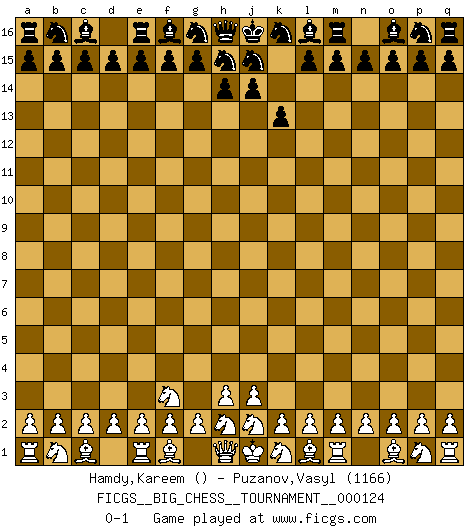 Last move : 0-1 2020 September 16 11:43:54 [Event "FICGS__BIG_CHESS__TOURNAMENT__000124"] [Site "FICGS"] [Date "2020.07.17"] [Round "1"] [White "Hamdy,Kareem"] [Black "Puzanov,Vasyl"] [Result "0-1"] [WhiteElo ""] [BlackElo "1166"] 1.g1-f3 k15-k13 0-1 This big chess game has been lost on time (started : 2020.07.17 9:36:30) Follow this game move after move (download)Good offense and good defense both begin with good development. (Bruce A. Moon) Die Neutralität betrachte ich als eine schwere Krankheit. (Viktor Kortschnoi) Bobby solo arroja las piezas y solas caen en las casillas correctas. (Miguel Najdorf ) Avant la finale, les dieux ont créé le milieu de partie. (Tarrasch) Knowledge rests not upon truth alone, but upon error also. (Carl G. Jung)