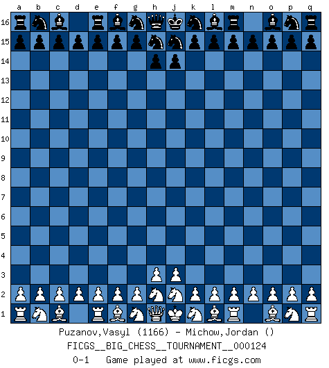 Last move : 0-1 2020 August 16 19:5:55 [Event "FICGS__BIG_CHESS__TOURNAMENT__000124"] [Site "FICGS"] [Date "2020.07.17"] [Round "1"] [White "Puzanov,Vasyl"] [Black "Michow,Jordan"] [Result "0-1"] [WhiteElo "1166"] [BlackElo ""] 0-1 This big chess game has been lost on time (started : 2020.07.17 9:36:30) Follow this game move after move (download)Strategy requires thought, tactics require observation. (Max Euwe) Immer nach dem besten Zug zu suchen ist ziemlich unpraktisch. (Nigel Short) Una mala movida nulifica cuarenta buenas. (Horowitz) La tactique est l'élément le plus important du milieu de jeu. (Siegbert Tarrasch) Man is reluctant to give credit for intelligence to anyone, except his enemies. (Albert Einstein)
