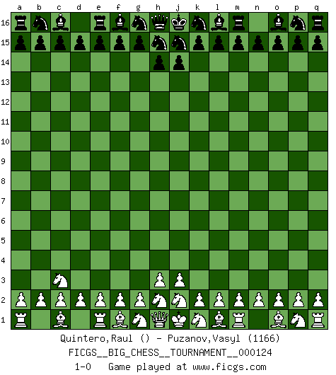 Last move : 1-0 2020 August 17 7:54:59 [Event "FICGS__BIG_CHESS__TOURNAMENT__000124"] [Site "FICGS"] [Date "2020.07.17"] [Round "1"] [White "Quintero,Raul"] [Black "Puzanov,Vasyl"] [Result "1-0"] [WhiteElo ""] [BlackElo "1166"] 1.b1-c3 1-0 This big chess game has been lost on time (started : 2020.07.17 9:36:30) Follow this game move after move (download)You have to have the fighting spirit. You have to force moves and take chances. (Bobby Fischer) Ein Isolani verdüstert die Stimmung auf dem ganzen Schachbrett. (Savielly Grigorievitsch Tartakower) Sin errores no puede haber brillantez. (Emanuel Lasker) Dans le domaine de la peinture, de la gravure et de la sculpture, dès la première décennie de notre siècle, les artistes abandonnent la représentation de la partie d'échecs pour se concentrer sur les pièces, sur les échiquiers et sur toutes les variations auxquelles les unes et les autres peuvent donner lieu. On passe en quelque sorte d'un thème social à un thème musical (au sens de la musica médiévale, c'est-à-dire d'une notion qui inclue le rythme, l'harmonie, la construction et la déconstruction, etc.). Graphiquement et picturalement, l'échiquier apparaît comme une structure ouverte, dynamique, d'une richesse infinie, autorisant toutes les combinatoires et débouchant sur des mouvements et des rythmes de nature exponentielle. (Michel Pastoureau) Humor is by far the most significant activity of the human brain. (Edward De Bono)