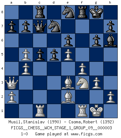 Last move : 1-0 2007 October 1 22:52:41 [Event "FICGS__CHESS__WCH_STAGE_1_GROUP_09__000003"] [Site "FICGS"] [Date "2007.07.11"] [Round "1"] [White "Musil,Stanislav"] [Black "Csoma,Robert"] [Result "1-0"] [WhiteElo "1990"] [BlackElo "1392"] 1.f4 Nf6 2.Nf3 g6 3.d4 Bg7 4.c4 c5 5.d5 d6 6.Nc3 e6 7.Qa4 Nbd7 8.dxe6 fxe6 9.Qd1 Nb6 10.e4 O-O 11.Be2 Qe7 12.O-O Bd7 13.e5 Ne8 14.Be3 Rc8 15.Qb3 Bc6 16.Nb5 Bxb5 17.cxb5 d5 18.Qa3 Bh6 19.g3 Qc7 20.Rac1 Nd7 21.b4 1-0 This chess game has been lost on time (started : 2007.07.11 17:2:47) Bird's Opening Kingside Castling by player Black (move 10) Kingside Castling by player White (move 12) Player White won this chess game. Follow this game move after move (download)A big shock; the best chess player in history has passed away. (Lajos Portisch, about Bobby Fischer's death) Aljechin war kein Nazi. Er war ein Opportunist. Ein schrecklicher Mann. Er liebte Geld über alles und würde für Geld ein Jude, ein Katolik oder ein Protestant werden. (Miguel Najdorf) El Ajedrez es 99 por ciento táctica. (Teichmann) Toutes les manuvres exécutées sur une colonne ouverte ont pour but ultime l'intrusion définitive sur la septième ou la huitième rangée, en plein cur de la position ennemie. (Aaron Nimzovitch) Perception is reality. (Immanuel Kant)