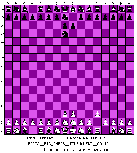 Last move : 0-1 2020 August 18 11:57:56 [Event "FICGS__BIG_CHESS__TOURNAMENT__000124"] [Site "FICGS"] [Date "2020.07.17"] [Round "1"] [White "Hamdy,Kareem"] [Black "Benone,Mateia"] [Result "0-1"] [WhiteElo ""] [BlackElo "1507"] 1.m2-m3 j15-h13 0-1 This big chess game has been lost on time (started : 2020.07.17 9:36:30) Follow this game move after move (download)The game of chess is the touchstone of the intellect. (Goethe) Nie in meinem Leben habe ich die französische Verteidigung gespielt, welche die Stumpfsinnigste von allen ist. (Wilhelm Steinitz) Me gusta decir que Bobby Fischer fue el mejor jugador que jamás haya existido. Pero lo que hizo de Fischer un genio, fue su habilidad de mezclar una frescura y pragmatismo Americano con ideas Rusas acerca de la estrategia. (Bruce Pandolfini) La vie est comme un jeu d'échecs : nous esquissons un plan, mais celui-ci est tributaire de ce que daignent faire l'adversaire aux échecs et le destin dans la vie. (Arthur Schopenhauer) What doesn't kill us makes us stronger. (Friedrich Nietzsche)